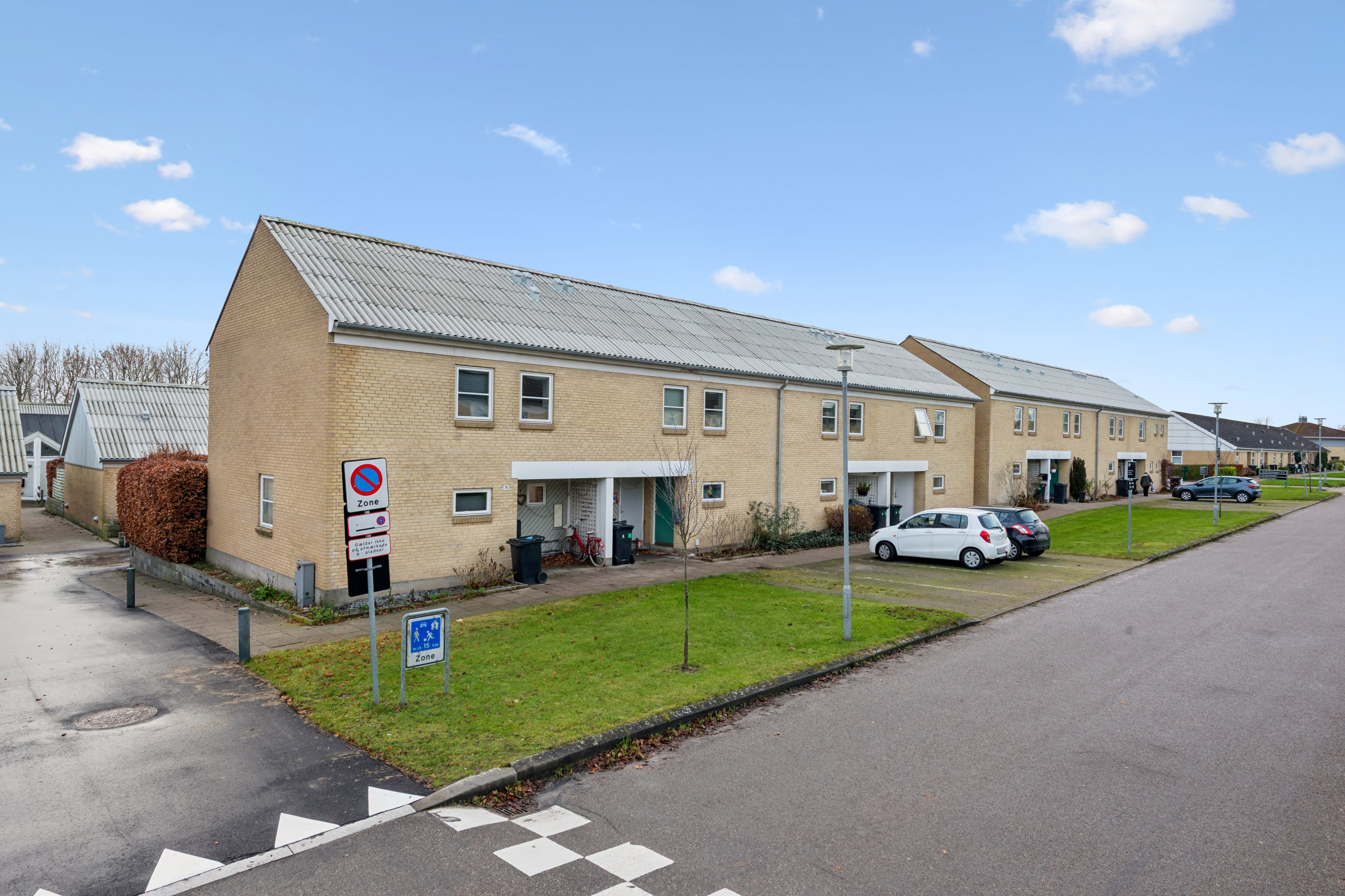 Bebyggelsen er opført i 1992 og består af klassiske gulstenshuse i to plan. Flotte, grønne fællesarealer lægger sig mellem husene, og der er flere legepladser i nabolaget, så børnene kan trygt mødes med kammeraterne her på det lukkede vænge. I kan desuden glæde jer over alt fra fjernvarme til en lav boligydelse, så der er gode nyheder, allerede før I træder over dørtærsklen.