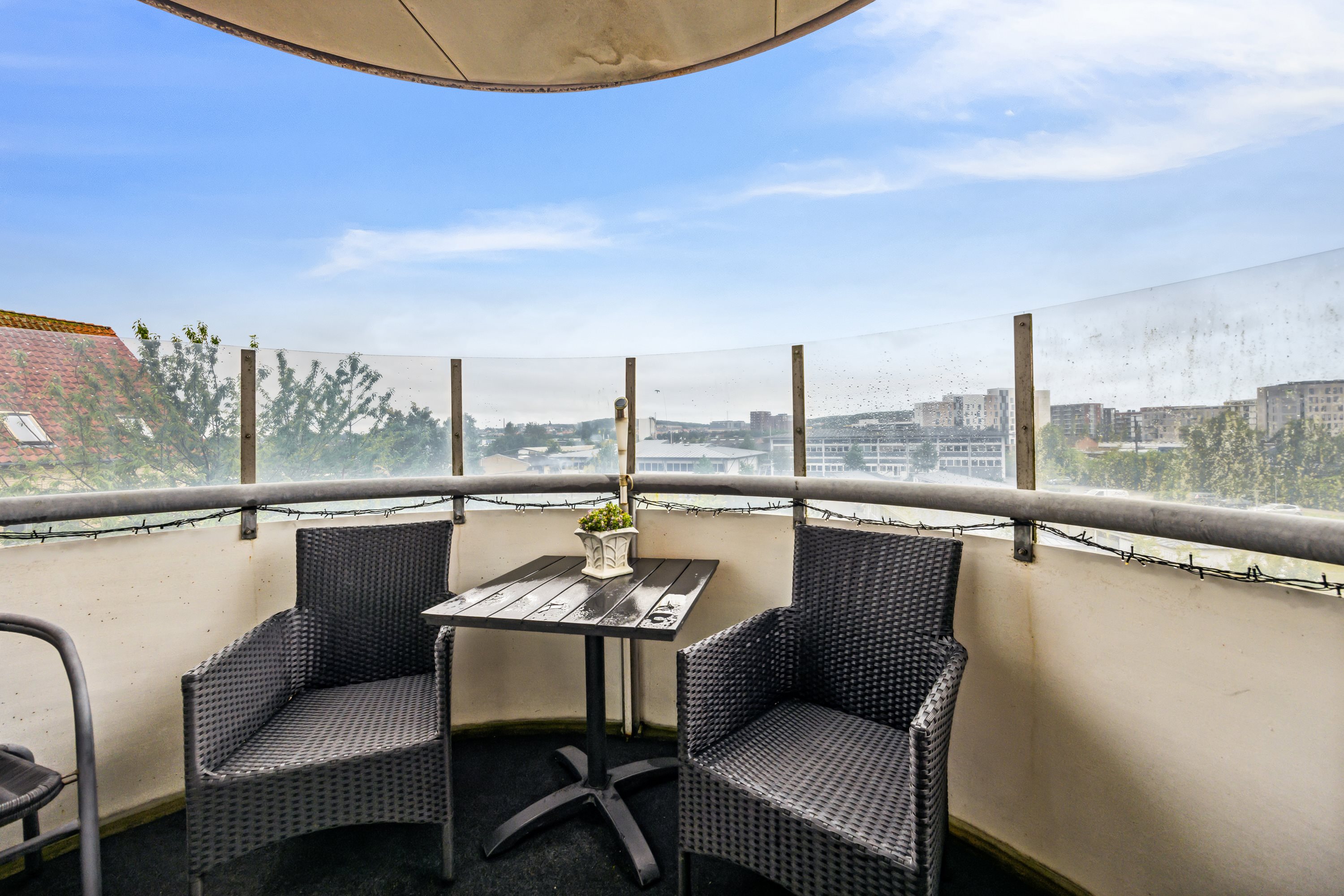 Stuen, der er i åben forbindelse med køkkenet, byder på masser af plads til kulinarisk udfoldelse og hyggelige middage.Et af de store plusser ved denne lejlighed er den solrige altan, hvor du kan nyde din morgenkaffe eller et glas vin i aftensolen. Med udsigt over byens tage er det den ideelle plads til at slappe af efter en lang dag.Lejligheden tilbyder desuden et stort badeværelse med fine faciliteter, der sikrer en start på dagen uden trængsel og alarm.For dem, der har behov for flere værelser, rummer den store stue fremragende muligheder for etablering af et yderligere værelse – perfekt til gæster eller som et hjemmekontor.