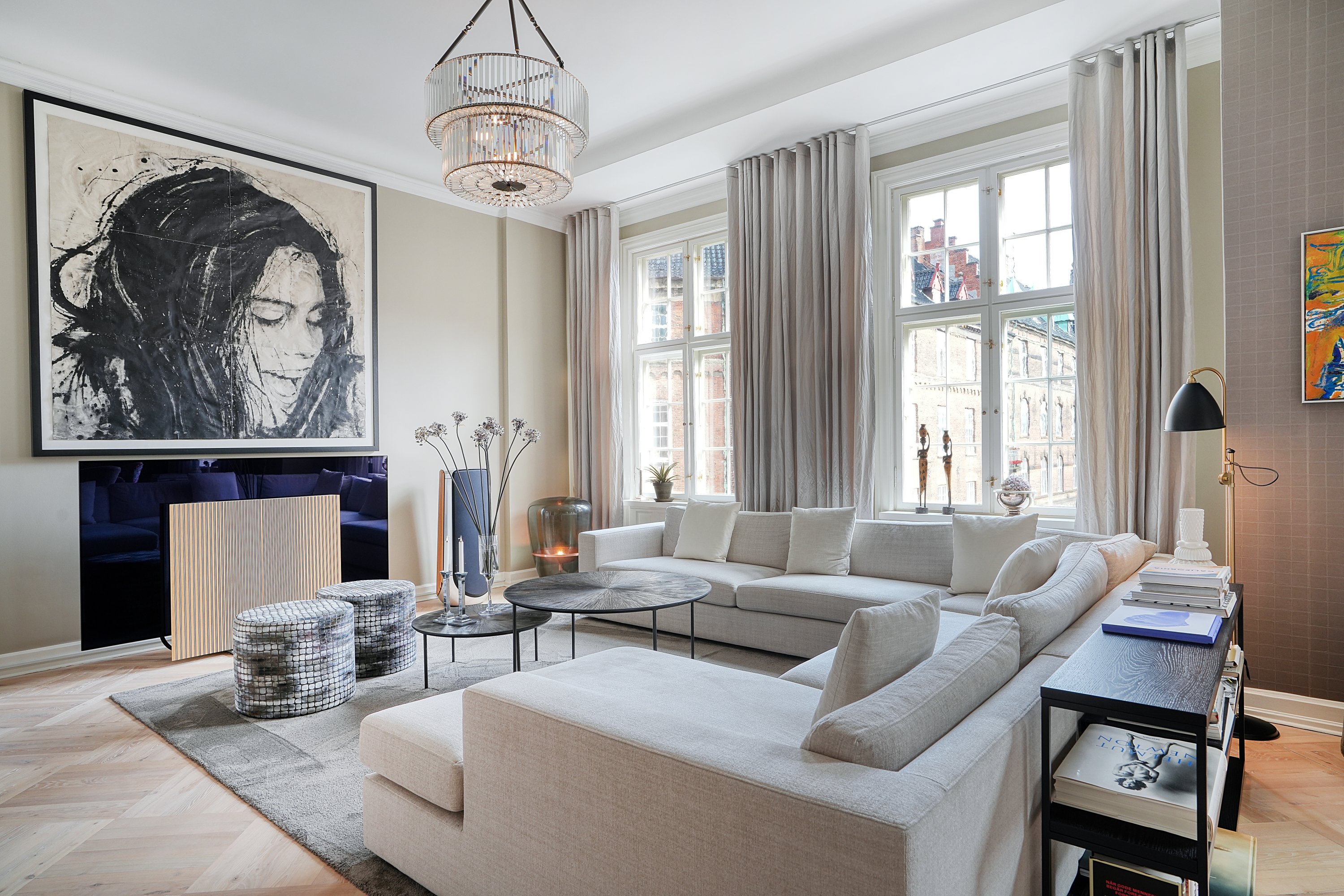 Lejligheden har gennem de seneste år gennemgået en omfattende og gennemgribende renovering. Der er lagt smukke, gennemgående parketgulve, og alle elementer i køkken, badeværelser og walk-in er udført med eksklusive HIGH END-løsninger fra Poliform. Badeværelserne er indrettet med travertin, fritstående badekar og håndvaske, og der er generelt smukke dørpaneler samt radiatorafskærmninger. Indretningen byder på en stor forstueentré, hvorfra der er adgang til et sublimt køkken-alrum indrettet med de mest luksuriøse løsninger og hårde hvidevarer i absolut topklasse. Det ovale køkken-alrum har et smukt vinduesparti mod gården og naturligvis vinkøleskabe. Herfra er der adgang til den meget store dagligstue – oprindeligt to stuer – hvor spisestuen er placeret i den ene ende og sofamiljøet i den anden. Den imponerende loftshøjde giver samtidig optimale muligheder for at opstille kunst og dekorative installationer. Derudover rummer lejligheden en pejsestue med bar og unikke indbyggede løsninger, et gæsteværelse/kontor med indbyggede skabe samt et master soveværelse med direkte adgang til et luksuriøst badeværelse med kar og brus og separat toilet. Til gæsteværelset/kontoret hører der eget badeværelse. Bagest i lejligheden findes desuden et funktionelt vaskerum.