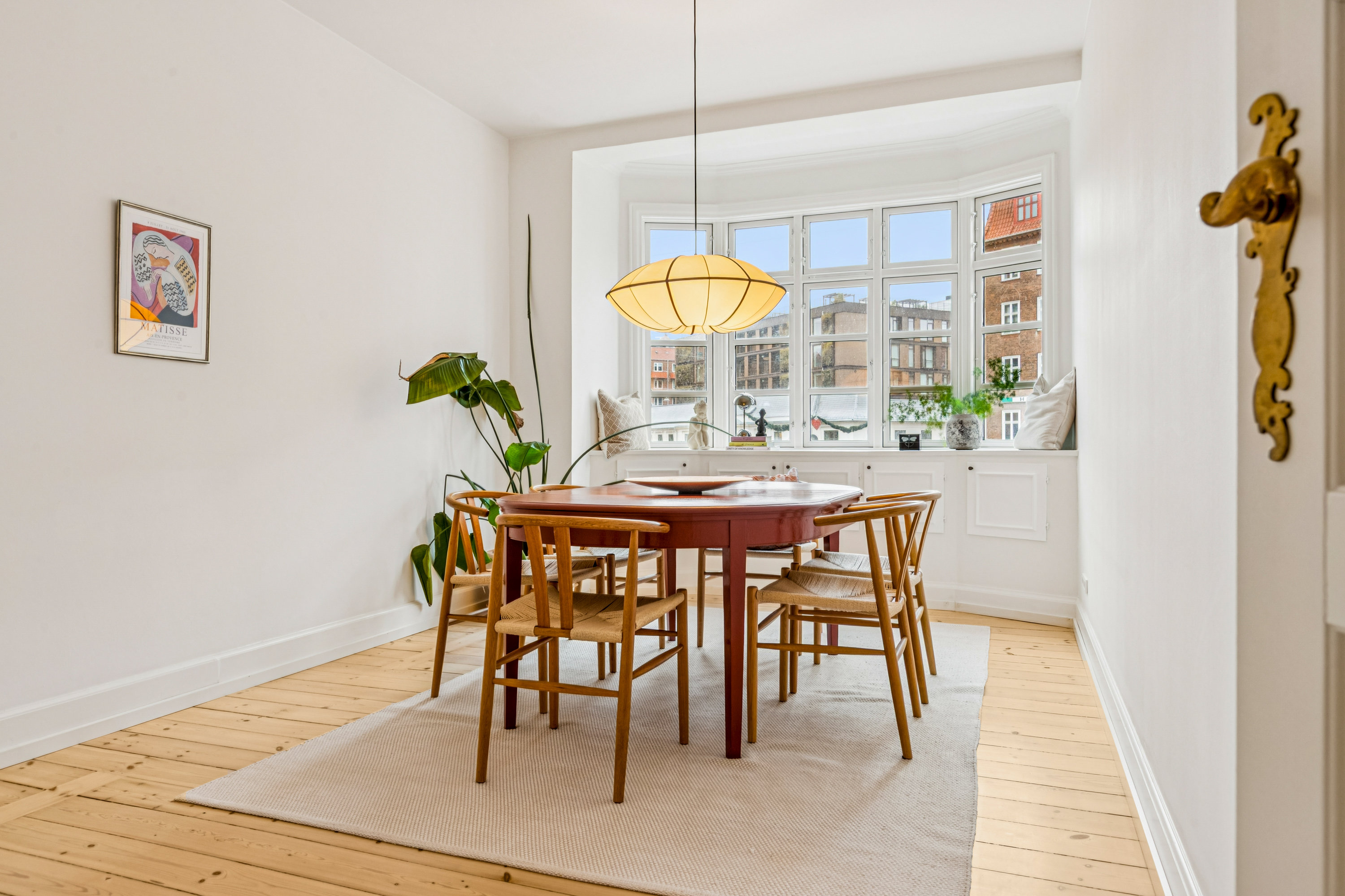 Boligen består i dag af et dejligt soveværelse, en hyggelig spisestue med charmerende karnap, der giver rummet et smukt lys, samt en indbydende stue velegnet som sofa- og opholdsrum. Der er mulighed for at ændre rumfordelingen, hvis man ønsker eksempelvis to soveværelser eller en anden funktionel opdeling.