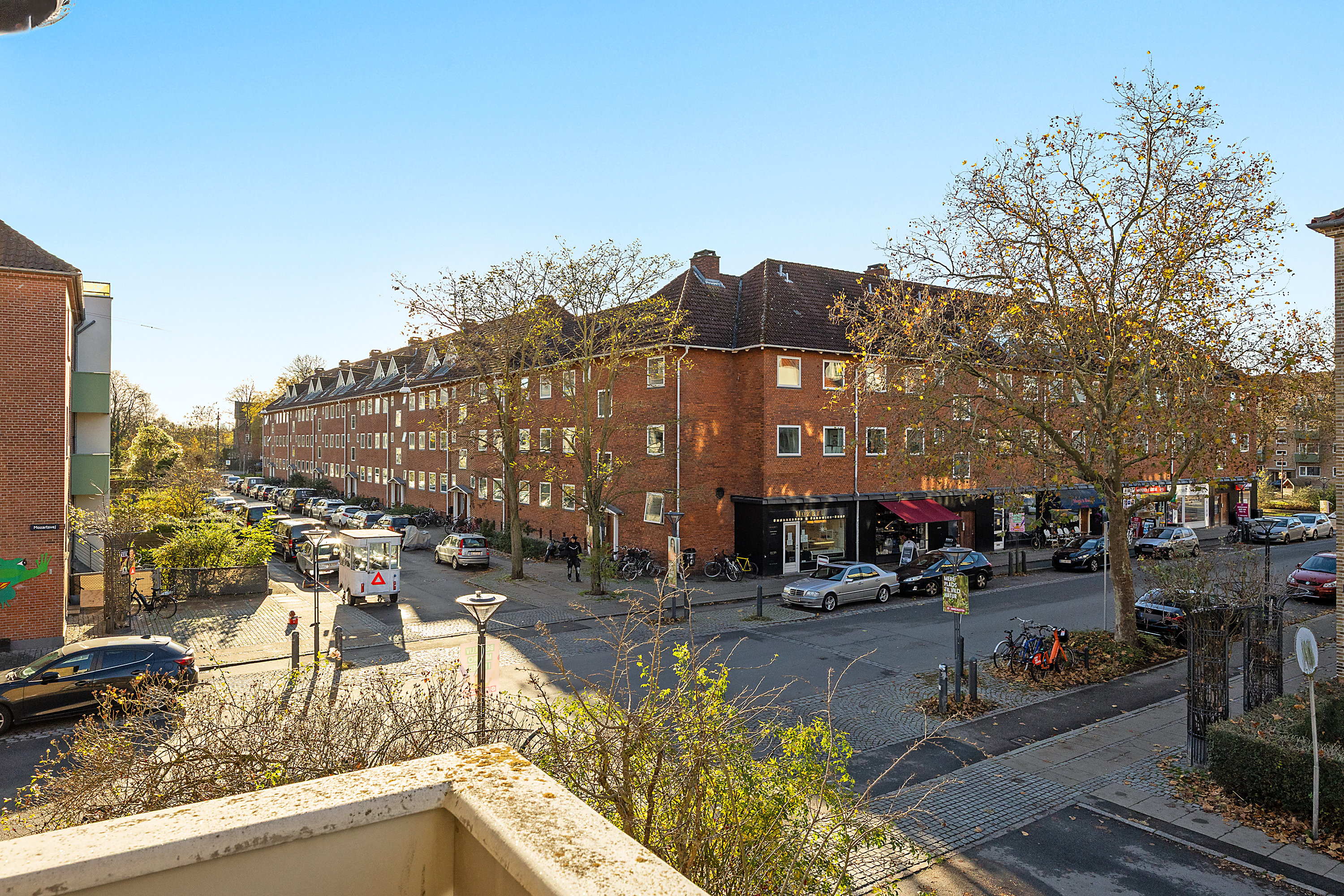 Velkommen til en af de der helt sjældent perfekt beliggende større lejligheder i det gamle Sydhavn. Lejligheden ligger på hjørnet af Mozartsvej og Offenbachvej, så altanen har både maksimal sol - Og den har også en helt særlig god udsigt mod syd ned langs Offenbachsvej, hvor du for enden kan skimte de store grønne træer og Karens Minde i horisonten. Lejligheden byder på 2 store soveværelser, det ene særlig stort med skabe langs endevæggen. Den lange fordelingsentre har flotte oprindelige fyrretræsplanker med godv vægplads til overtøj og lidt møblement. Badeværelset er stort og renoveret for år tilbage med klinkebeklædt bruseniche og væghængt toilet. Der er pdesuden plads til at installere vaskesøjle. Køkkenet er det klassisk aflange samtale køkken med vindue ud til den utrolig flotte gård. Stuen er vestvendt og ligger ud til Offenbachsvej med og har en hyggelig karnap, oplagt til spiseplads. Det er også fra dette rum du træder ud på den gode udsigtsaltan.