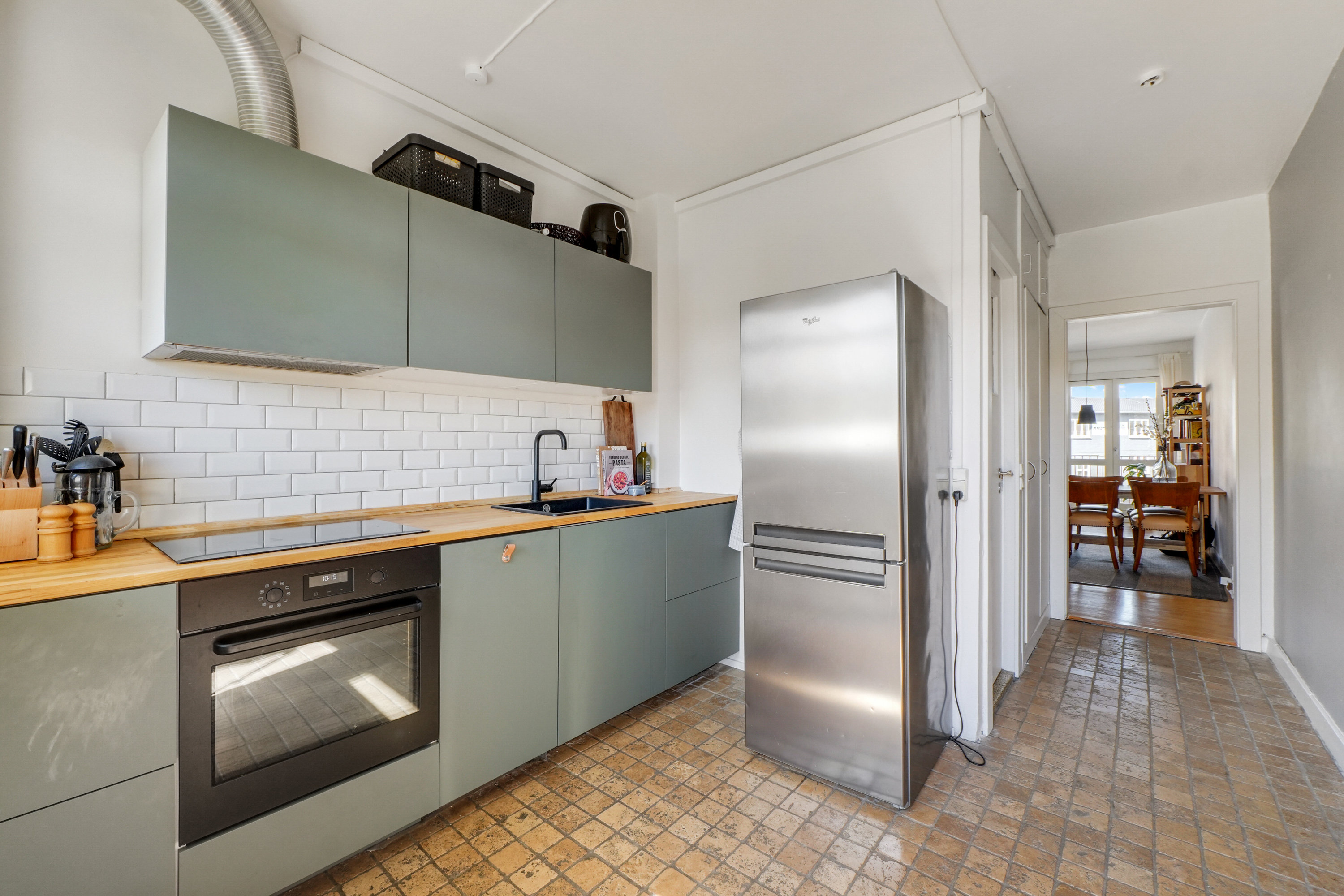Du træder indenfor i lækkert og helt åbent køkken med rustikke klinker på gulvet. Køkkenet er godt indrettet og opført i stilrent tidsløst design med grebsløse fronter. At det er så åbent, gør meget for at hjælpe lyset videre ind i lejligheden. Lidt længere fremme i gangen har du adgang til det store og meget nydelige badeværelse med separat bruseplads.