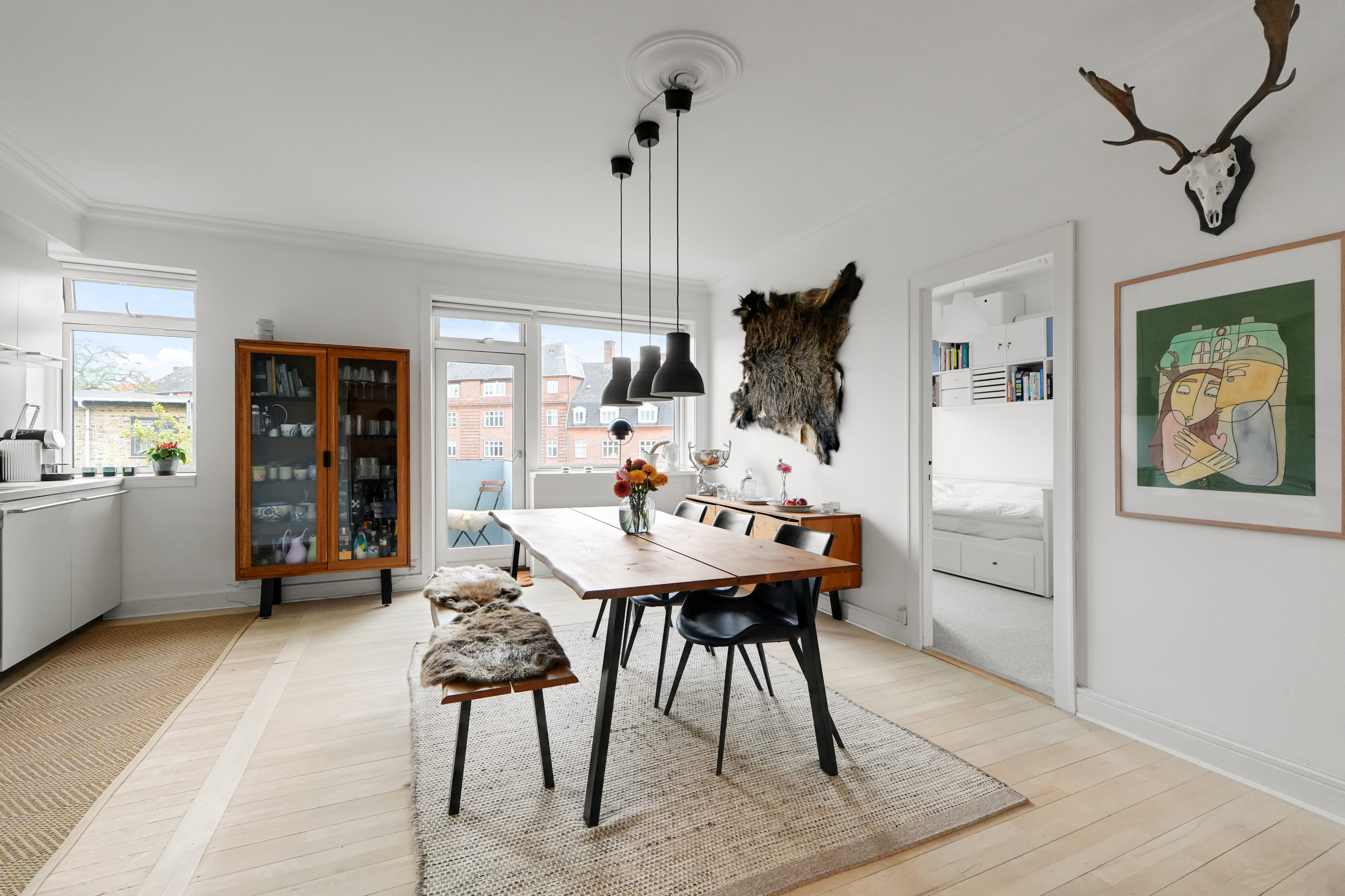 Lejligheden byder på en stor og indbydende stue med et dejligt lysindfald fra de store vinduer. Hertil kommer to rummelige værelser, der giver plads til både soveværelse, kontor eller gæsteværelse – alt efter behov. Det store køkken/alrum er et af boligens naturlige samlingspunkter – her er god bord- og skabsplads samt plads til et spisebord, hvor hverdagens måltider kan nydes i hyggelige omgivelser - herfra er der udgang til dejlig altan. Boligen fremstår pæn, velholdt og klar til indflytning, med smukke trægulve og klassiske detaljer.