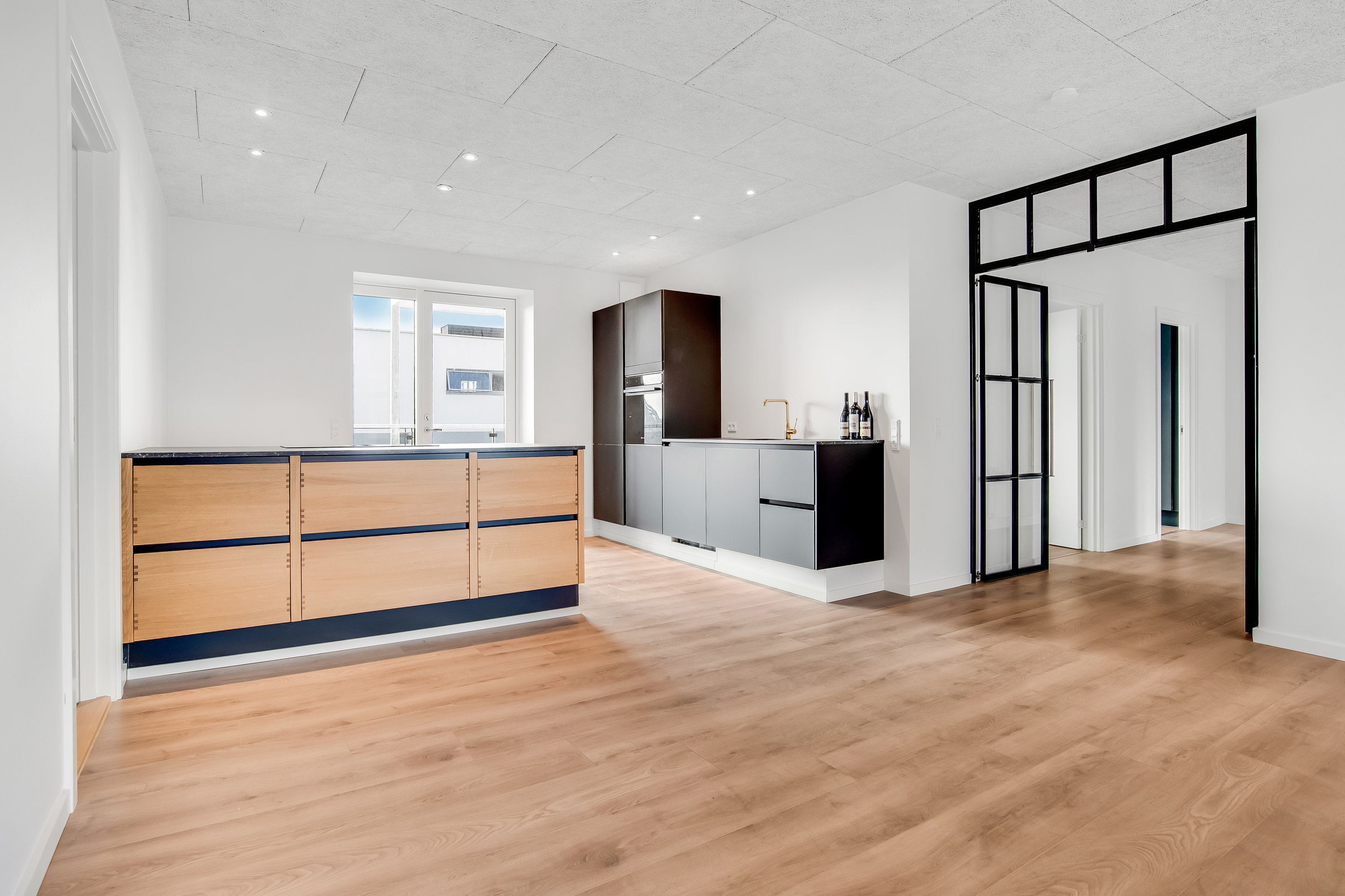 Lejligheden er renoveret og byder på en god indretning, flotte materialevalg og dejlige rum.
