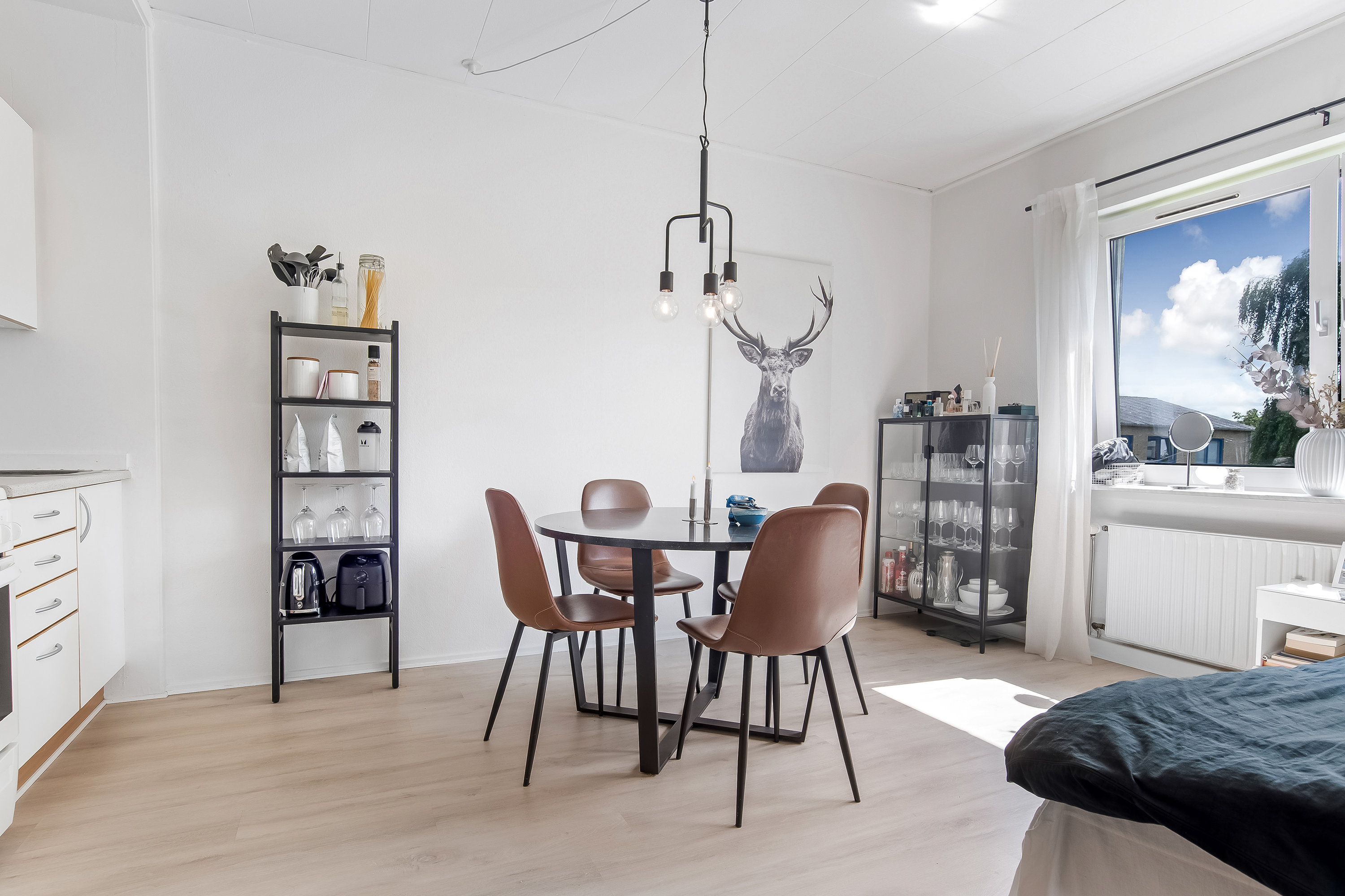 Du bydes velkommen i entreen, hvor der er skabsplads. Lys stue/køkken med lyst inventar. Lyst badeværelse med brus.