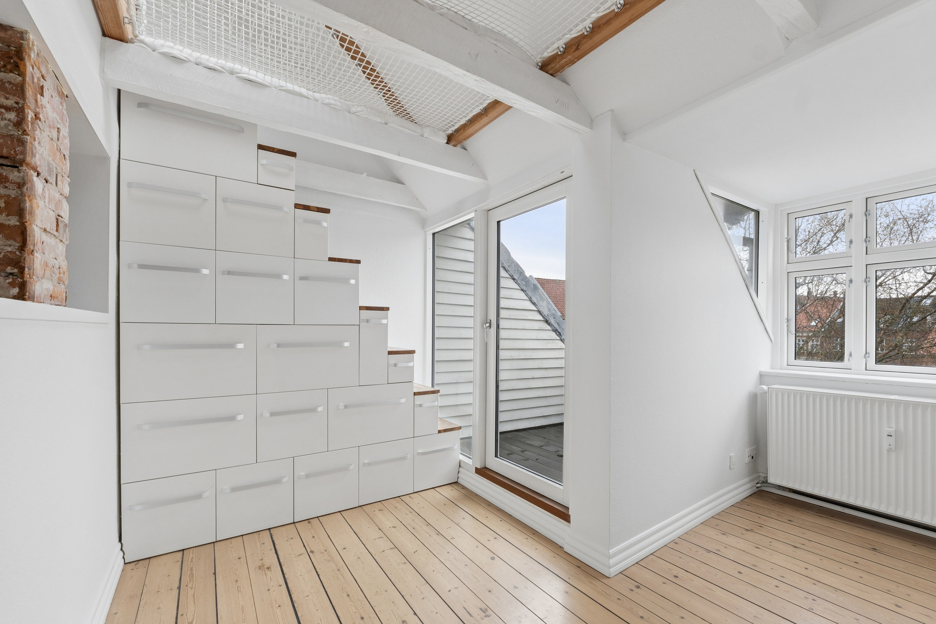 Herfra har du indgang til de to værelser, hvor det ene er oplagt til stue, da du også her har udgang til den skønne, solrige altan. I stuen er der bygget en smart garderobeløsning, som også fungerer som trappe op til hemsen.