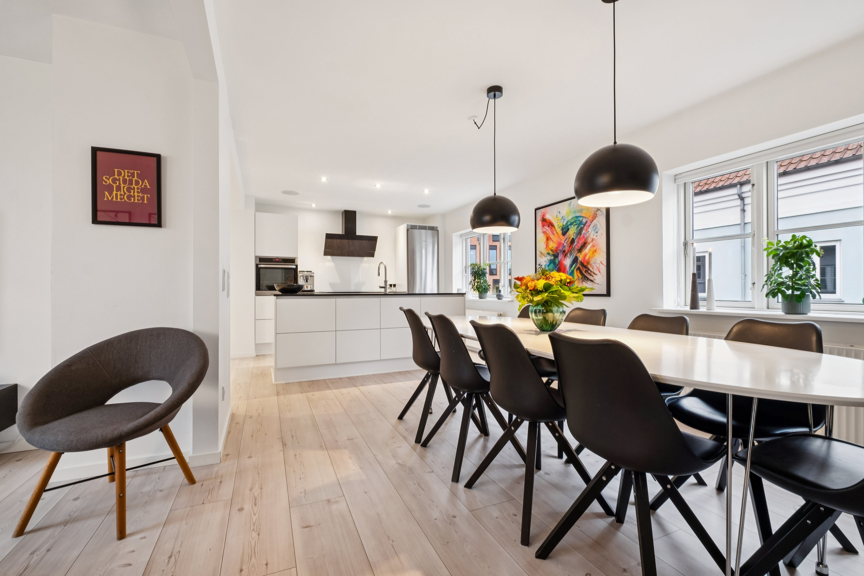 Glatte, hvide køkkenelementer fra Svane smelter grebsfrit sammen med omgivelserne og står i flot kontrast til den sorte granit, der også topper køkkenøen. På den anden side deraf indrettes resten af pladsen helt naturligt med plads til såvel spisebord som sofamøbler, mens det lyse og luftige opholdsrum får selskab af et viktualierum, et værelse og et bad. Ovenpå venter endnu to værelser og endnu et bad på lejlighedens pæne og funktionelle overetage.