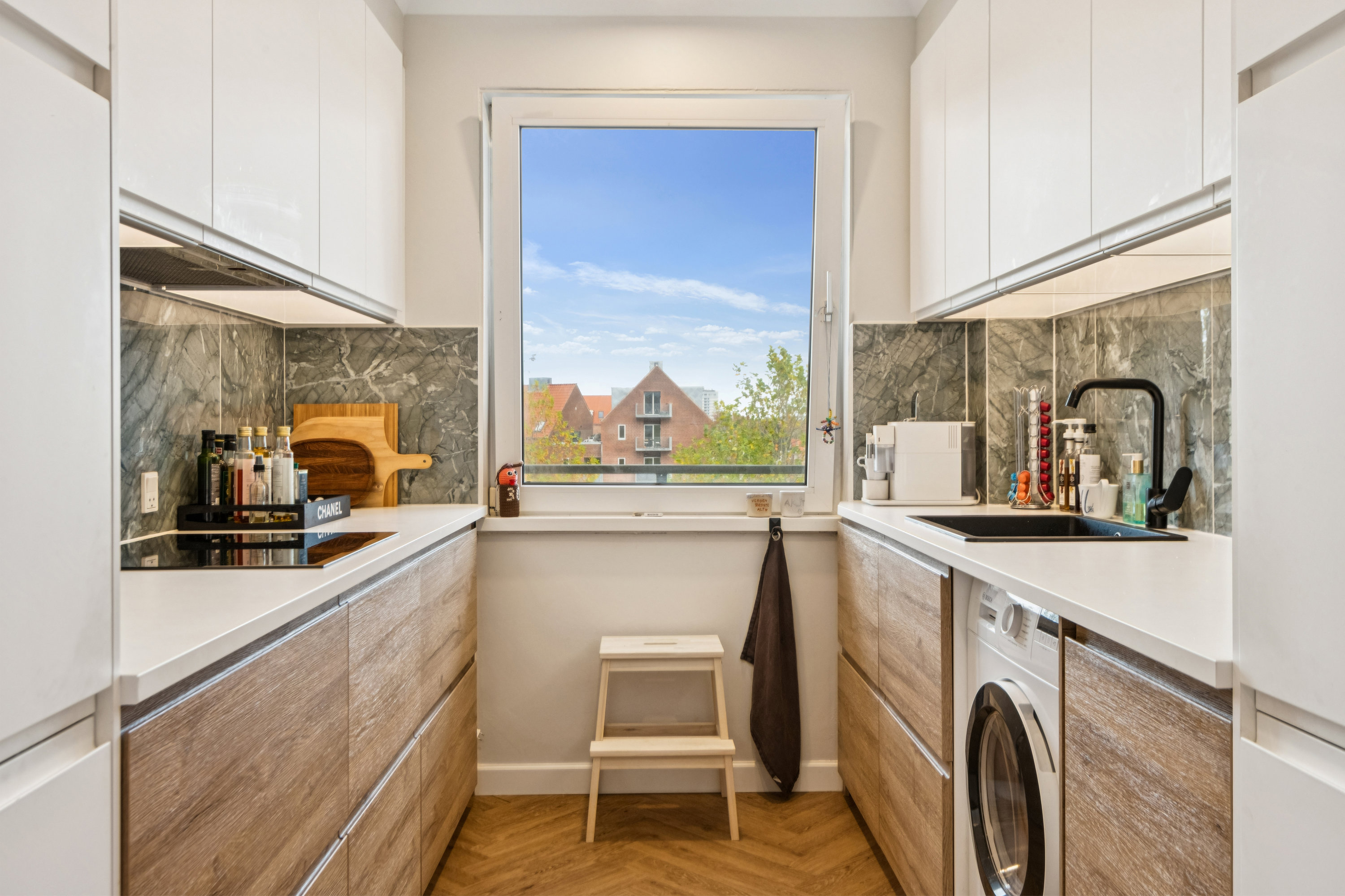 Køkkenet ligger centralt placeret og fremstår lyst og moderne med alle hårde hvidevarer – herunder opvaskemaskine og vaskemaskine. Fra køkkenet er der direkte adgang til den hyggelige stue, hvor store vinduespartier og udgang til altanen skaber et skønt lysindfald og en åben atmosfære. Altanen vender ideelt og den høje placering i bygningen giver mulighed for at nyde udsigten over byens tage.