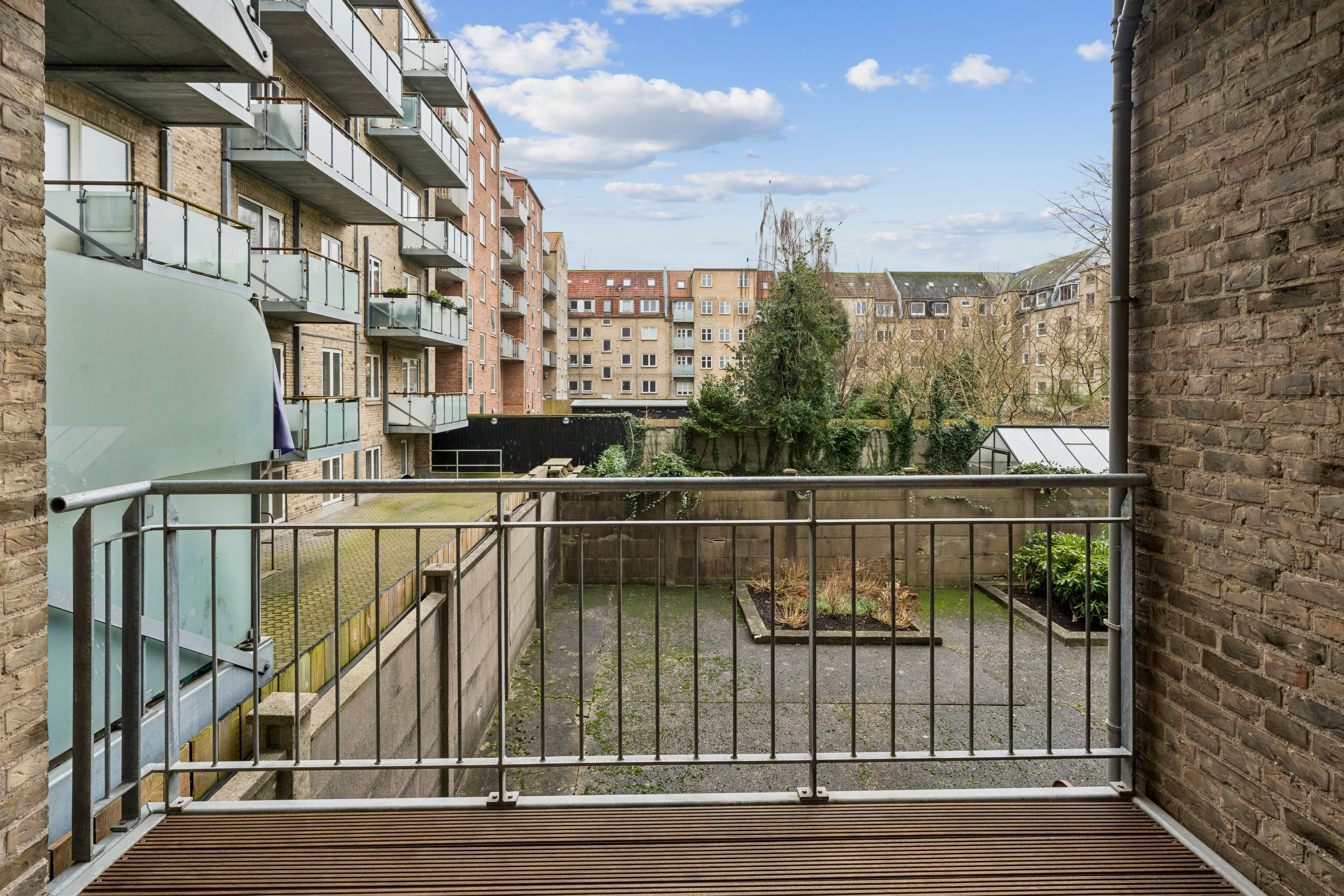 Dertil får du et stort soveværelse, hvor der både medfølger indbyggede skabe og plads nok til en stor seng. Fra værelset er der direkte udgang til lejlighedens altan, et skønt ekstra rum, hvor du kan nyde morgenkaffen, frisk luft eller solen. Altanen vender mod rolige omgivelser og giver en rar følelse af et privat uderum.