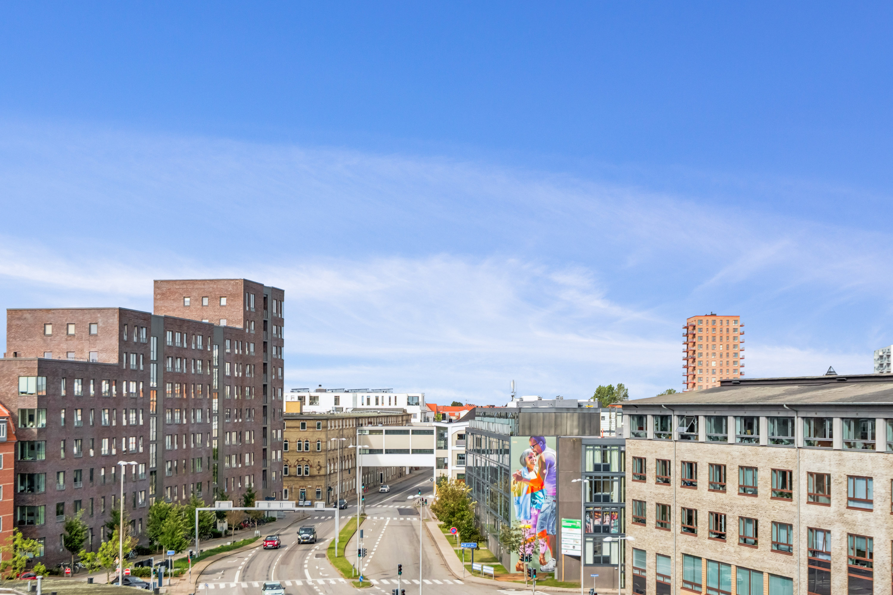 Lejligheden byder på en moderne og indbydende planløsning med et lækkert køkken-alrum i åben forbindelse med en stor stue. Her strømmer lyset ind fra panoramavinduerne og en fantastisk udsigt over byen-