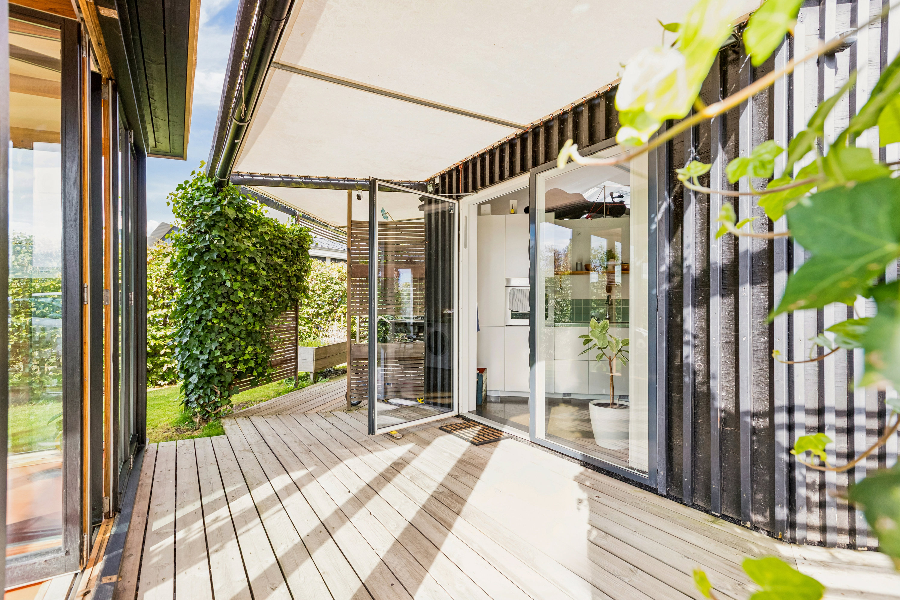 Ikke mindst i sommerhalvåret. Boligen kan i alle retninger åbnes mod haven og mod træterrassen, der følger huset hele vejen rundt.