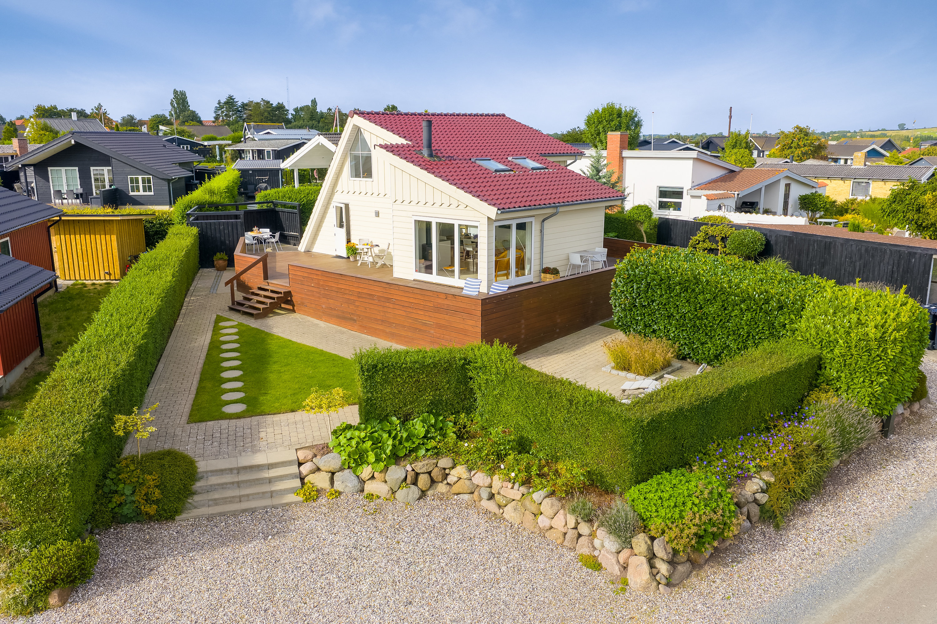 Udendørs er der en meget stor og flot træterrasse, som sammen med øvrige terrassearealer omkring huset giver gode muligheder for at finde solen hele dagen. Haven er velanlagt i flere niveauer, og der er to separate parkeringspladser på grunden. Bagerst i haven findes et fritliggende, isoleret redskabsskur.
