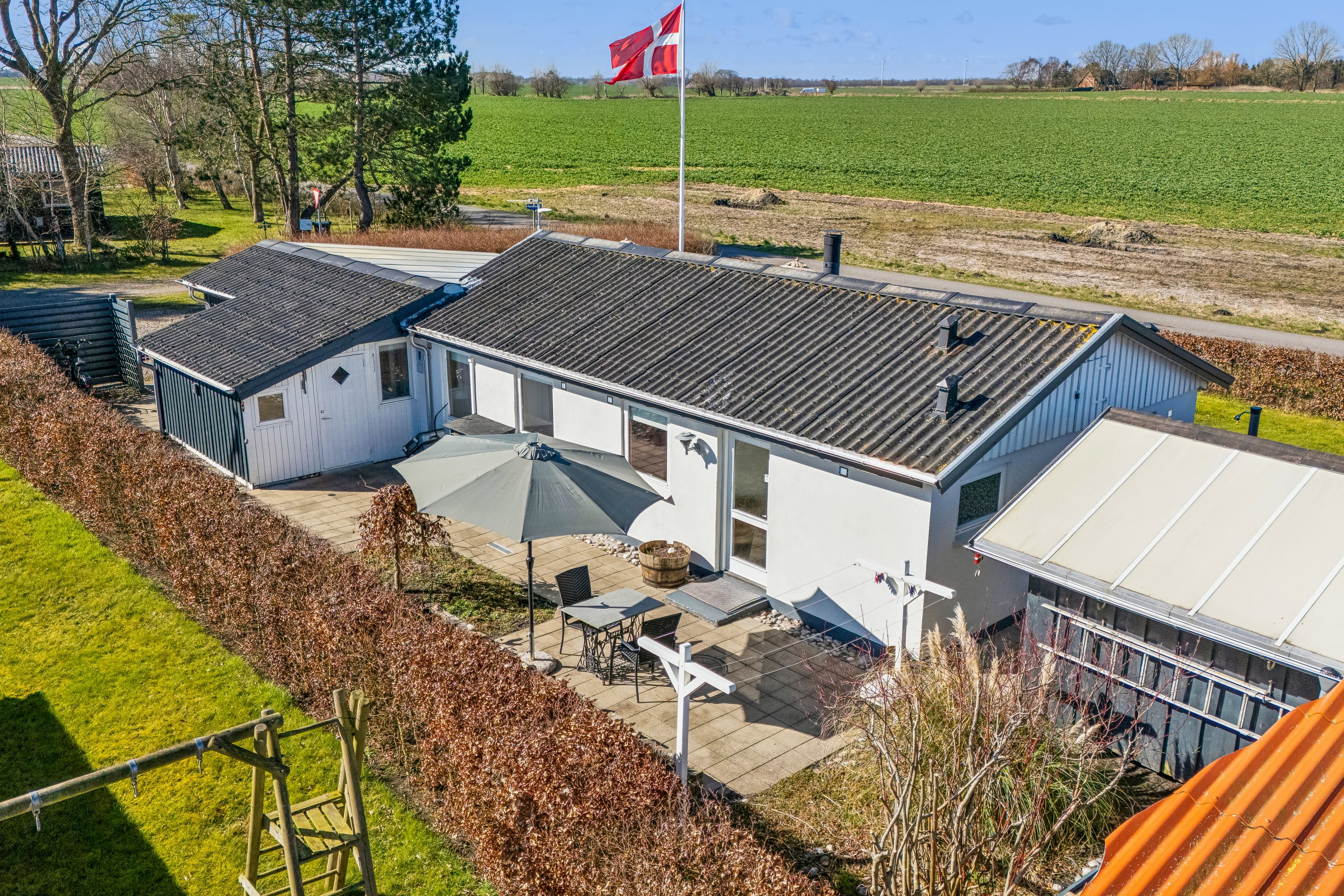 Udenfor venter et skønt udemiljø, hvor haven er nem at holde med en velfriseret græsplæne og en delvist overdækket fliseterrasse med plads til grill, udekøkken og siddepladser i både sol og skygge. De dejlige omgivelser fortsætter, som vi zoomer lidt ud, for området er i det hele taget grønt med mange små opholdssteder og legepladser. Der er heller ikke mere end 500 meter ned til kysten, hvor den skønneste badestrand venter, og i modsatte retning finder I indkøb i Bårdesø godt to kilometer væk, ligesom cyklen vil bringe jer let omkring i de naturskønne omgivelser.