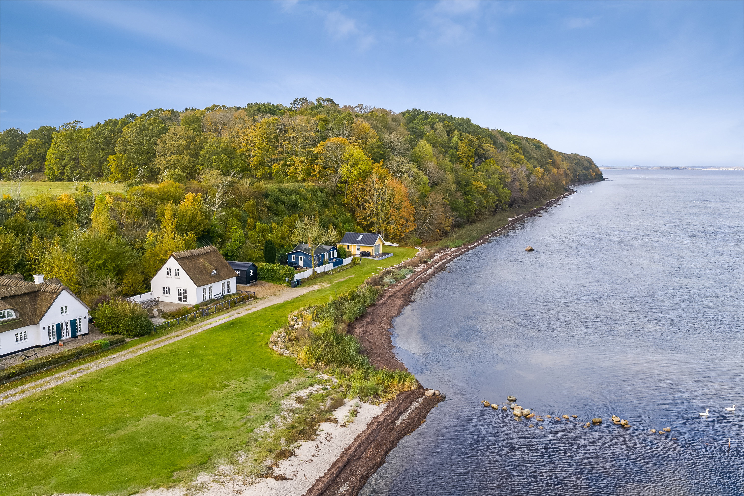 Det charmerende blå træhus ligger for enden af en blind vej med skoven lige ved siden af og en betagende udsigt over havet. Udsigten kan nydes fra terrassen – det perfekte sted at samle familie og venner til hyggelige måltider under den danske sommerhimmel.