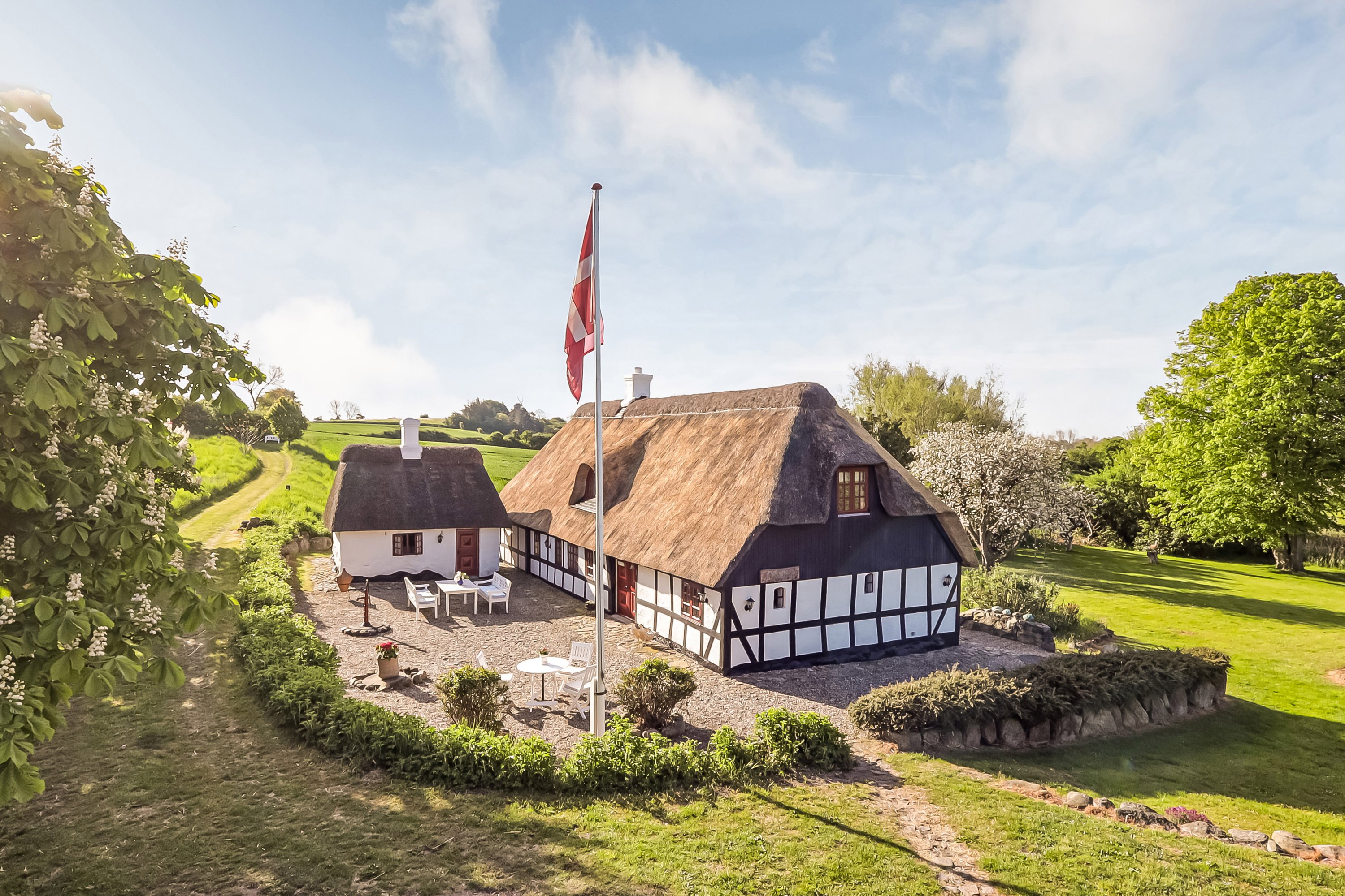 Ejendommen præsenterer sig flot med klassisk bindingsværk, pænt stråtag og mange originale detaljer bevaret. Indenfor bydes du velkommen i et hyggeligt og stemningsfuldt hjem, hvor store, massive fliser og synlige bjælker skaber en varm og indbydende atmosfære.