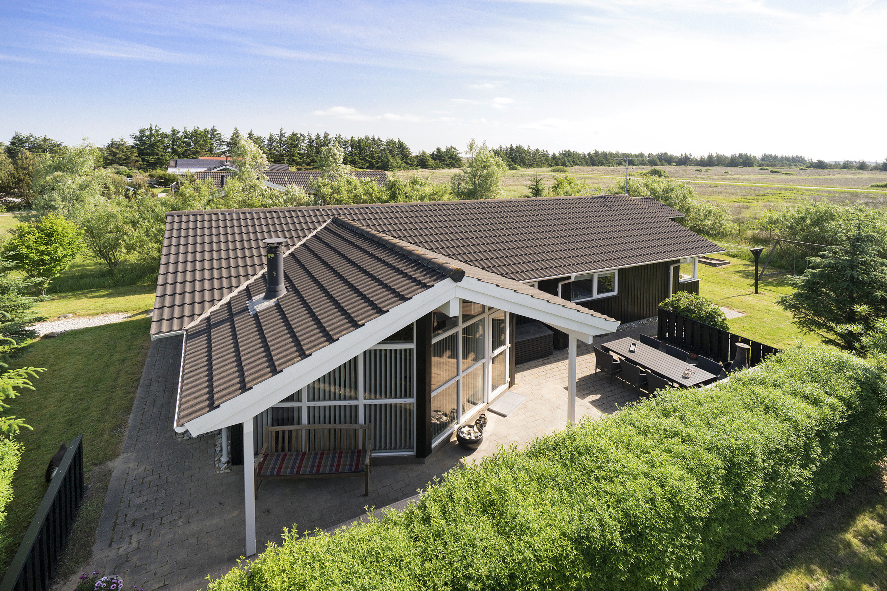 Udenfor venter en skøn, lukket have, omgivet af træer og buske, som giver både læ og privatliv. Her er der god plads til leg, hygge og afslapning på de forskellige terrasser.