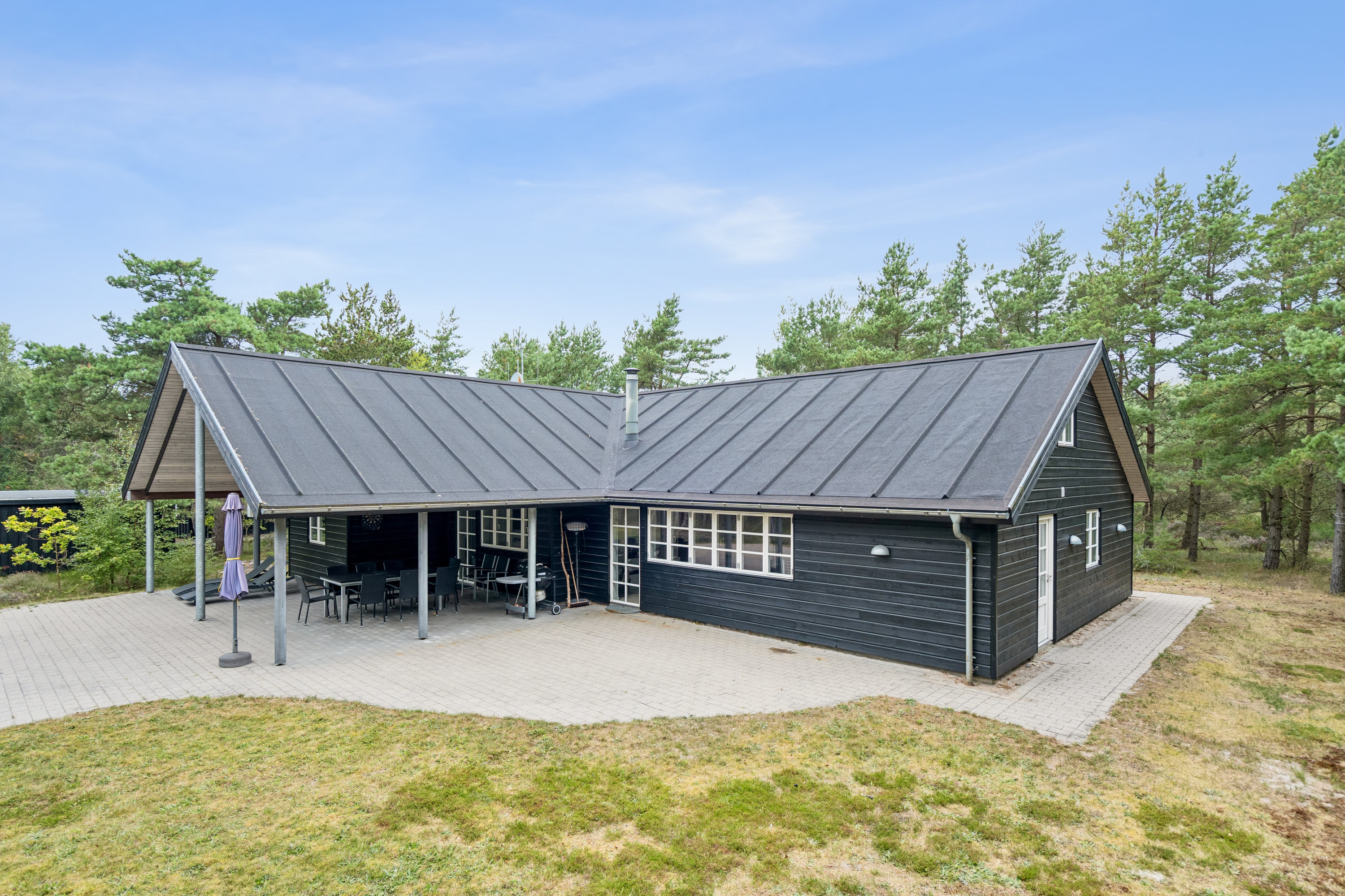 Huset er opført i 2009 i gode moderne materialer, med tagpap og med mange flotte detaljer. Man starter ved husets overdækkede indgang, inden man træder ind i husets entre/bryggers med vaskemaskine, tørretumbler og gulvvarme. Derfra er der adgang til husets ene badeværelse med bruseniche og gulvvarme. Derudover er der adgang til husets hjerte, som består af et stort flot køkken alrum med loft til kip, hvor der kan indtages hyggelige middage og børnene har mulighed for at lege i den ekstra stue der idag fungerer som aktivitetsrum med billardbord og har opgang til lille hems. Fra de to stuer er der en flot pejseindsats fra Rais som kan ses fra begge stuer. Fra alrummet er der udgang til den store lækre overdækkede terrasse og haven med hyggeligt bålsted og plads til leg. Der er fordelingsgang i åben forbindelse til køkken alrummet og herfra adgang til 2 af husets 3 gode værelser, hvor der i alt er 8 sovepladser. Huset har endvidere et stort, flot badeværelse med bruseniche, spa, infrarød sauna og gulvvarme. Der er ligeledes et integreret udhus. Huset opvarmes med luft til luft varmepumpe og pejs samt der er indlagt fibernet.