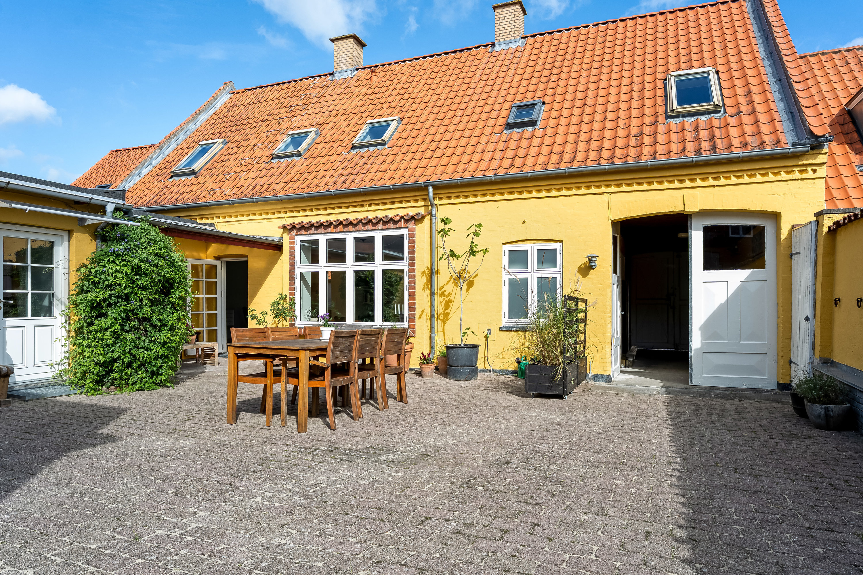 Bag huset åbenbarer der sig en stor, flisebelagt gårdhave med overdækket terrasse og masser af plads til både afslapning og socialt samvær. Her ligger også udhus og en tidligere staldbygning i to etager, der rummer enorme muligheder – hvad enten drømmen er værksted, gildesal, hobbyrum eller noget helt andet.