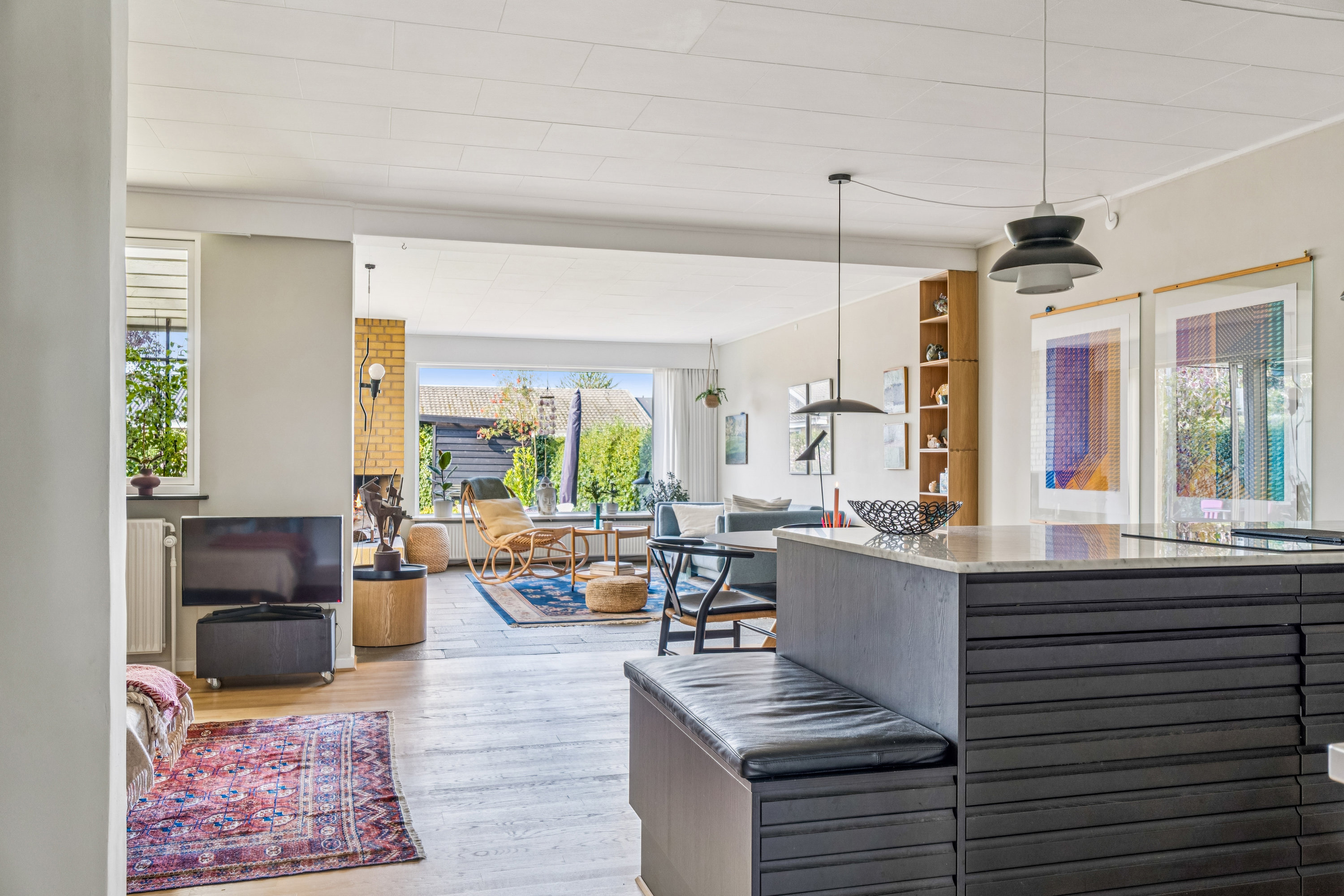 Dertil rækkehusets 127 kvadratmeter, der alt i alt fordeler sig over tre gode værelser, et bad, et toilet, en entré med plads til vaskefaciliteter, et godt loftrum og et åbent leverum. Det hele præsenterer sig lyst og pænt, og mens eksempelvis køkkenet vidner om gode opdateringer, kan 60’er-charmen fortsat mærkes i bl.a. den gulmurede pejs, som skaber stemning for enden af den store stue.