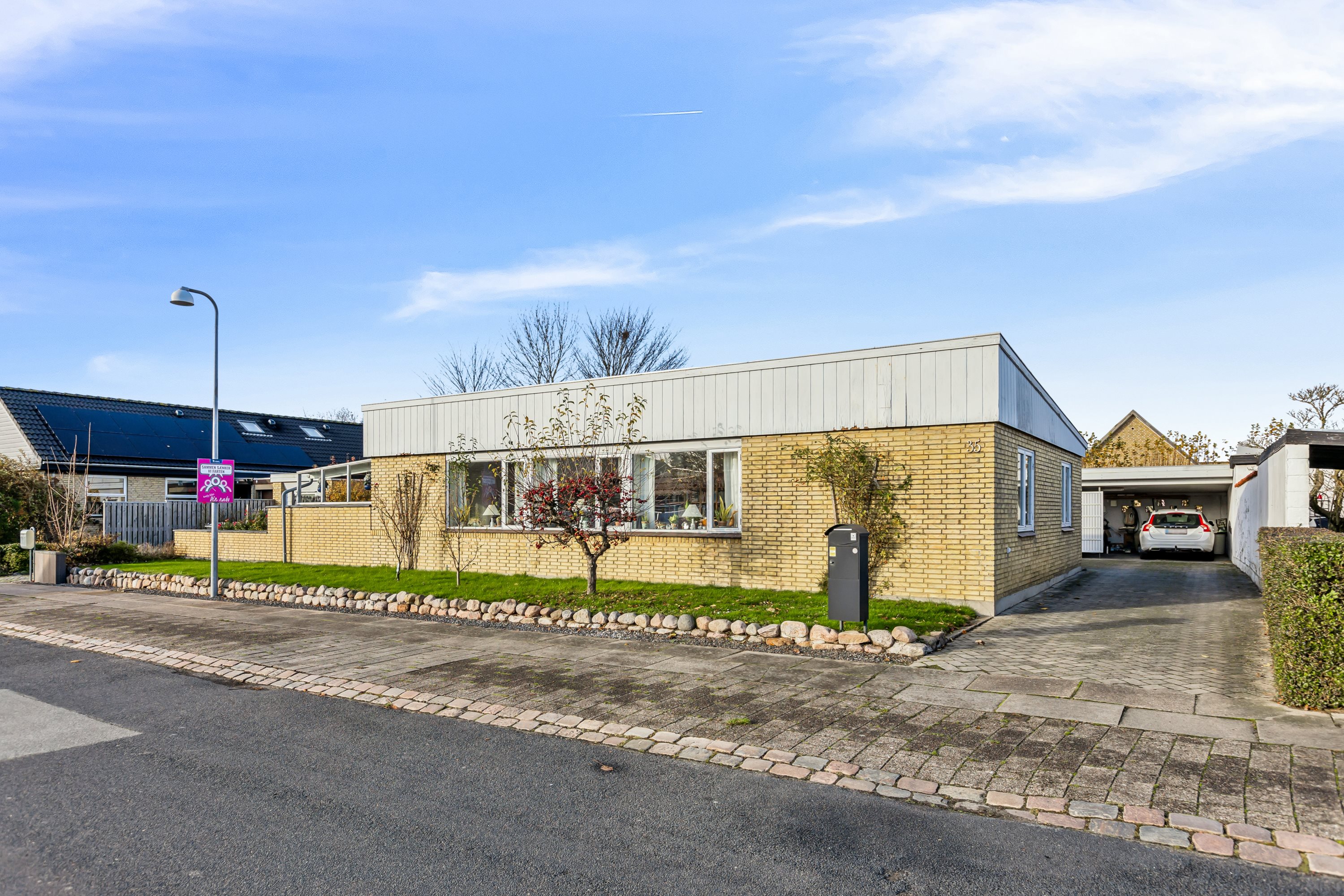 Med sine 114 velindrettede kvadratmeter byder boligen på fire rummelige værelser, herunder et soveværelse med praktisk indbygningsskab. Den lyse stue har direkte adgang til en overdækket terrasse, som skaber en naturlig forlængelse af opholdsrummet. Praktisk køkken samt rummeligt badeværelse.