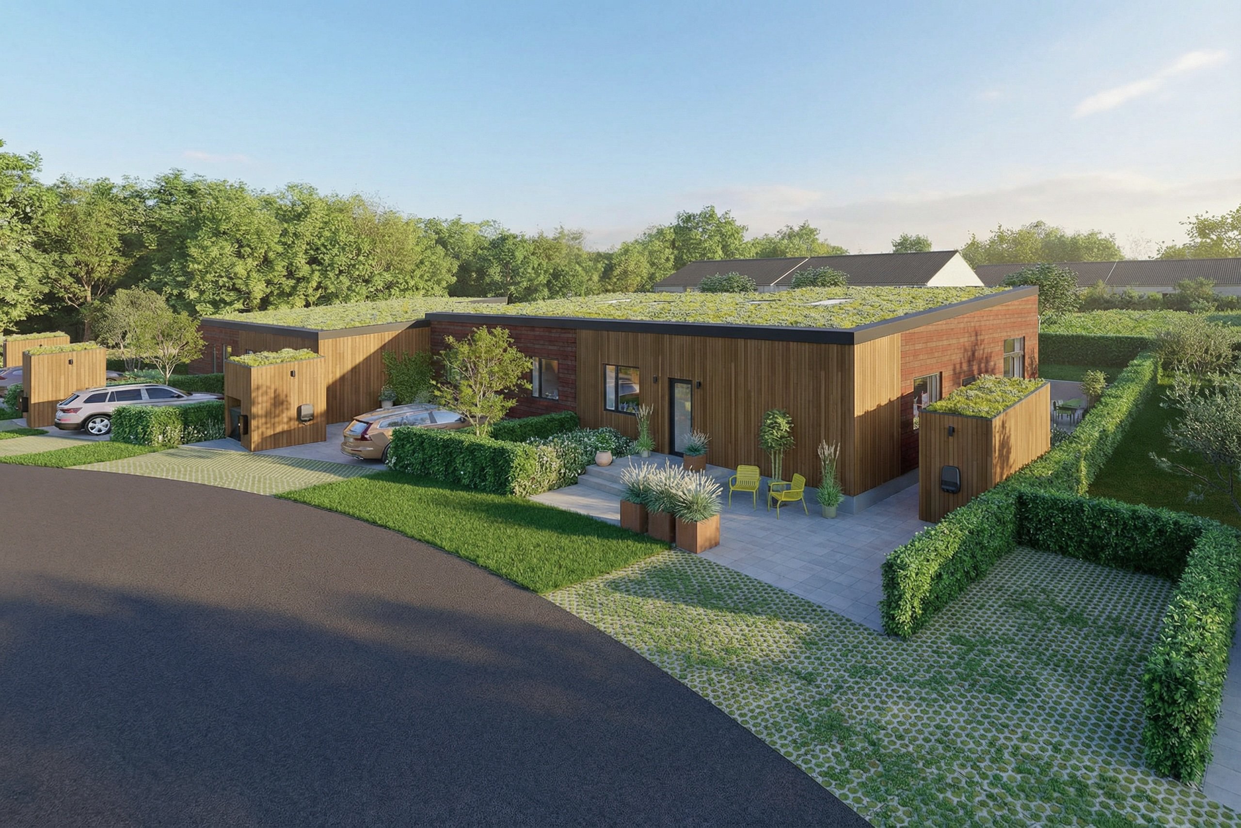 Boligen opføres i et moderne, energieffektivt byggesystem med højisolerende trækonstruktion, ensidig tagflade med tagpap og sedumtag samt facader i tegl og vulkanske stenplader. I køkken-alrum og værelset mod haven er der loft til kip med akustiklofter, som giver en lys og åben rumoplevelse. I bryggers, badeværelse og værelser mod vejen etableres nedhængte lofter til integration af installationer og ventilationsrør.