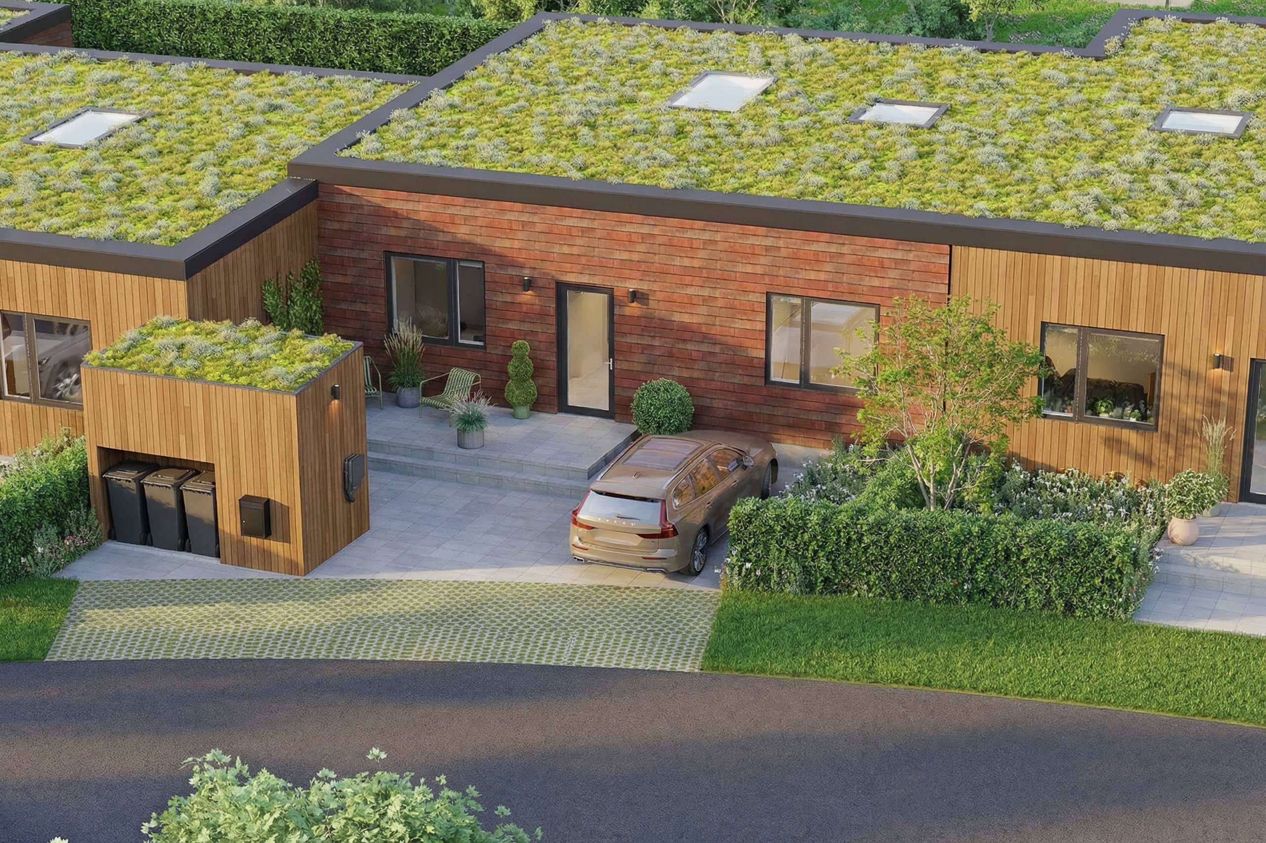Huset udføres i et moderne, energieffektivt byggesystem med højisolerende trækonstruktion, ensidig tagflade med tagpap og sedumtag, teglfacade og felter i vulkanske stenplader. I køkken-alrum og værelset mod haven er der loft til kip med akustiklofter, som giver en rummelig og luftig fornemmelse. I bryggers, badeværelse og værelser mod vejen etableres nedhængte lofter, hvor installationer og ventilationskanaler skjules.