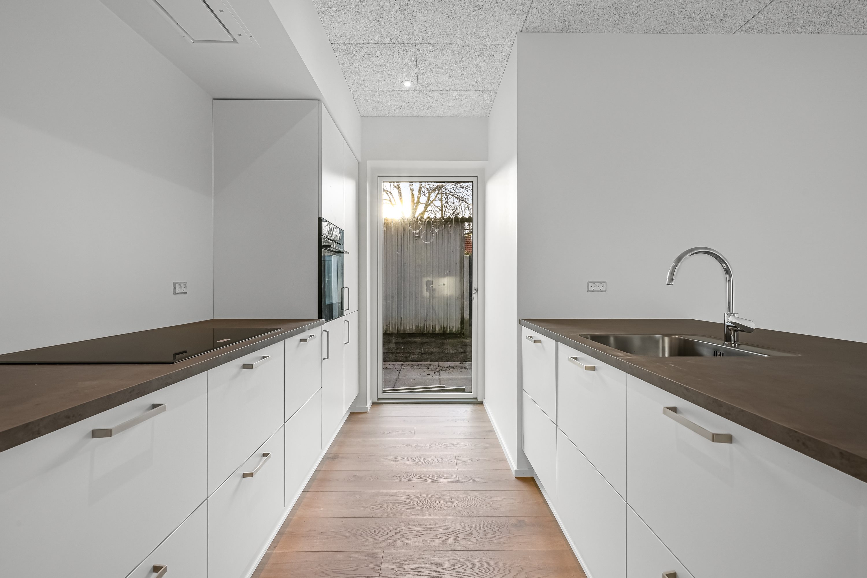 Gulvet er vedligeholdelsesvenligt laminatgulv og lofterne er troldtekt. Væggene leveres glatte hvidmalede.