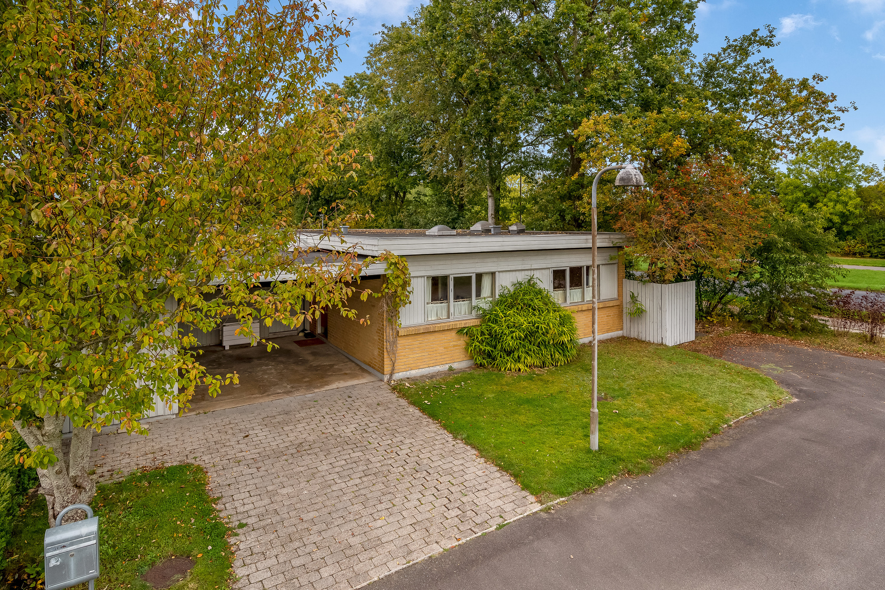 Flisebelagt indkørsel til carport med direkte adgang til entréen. Haven er anlagt med både græsplæne og gårdhave.