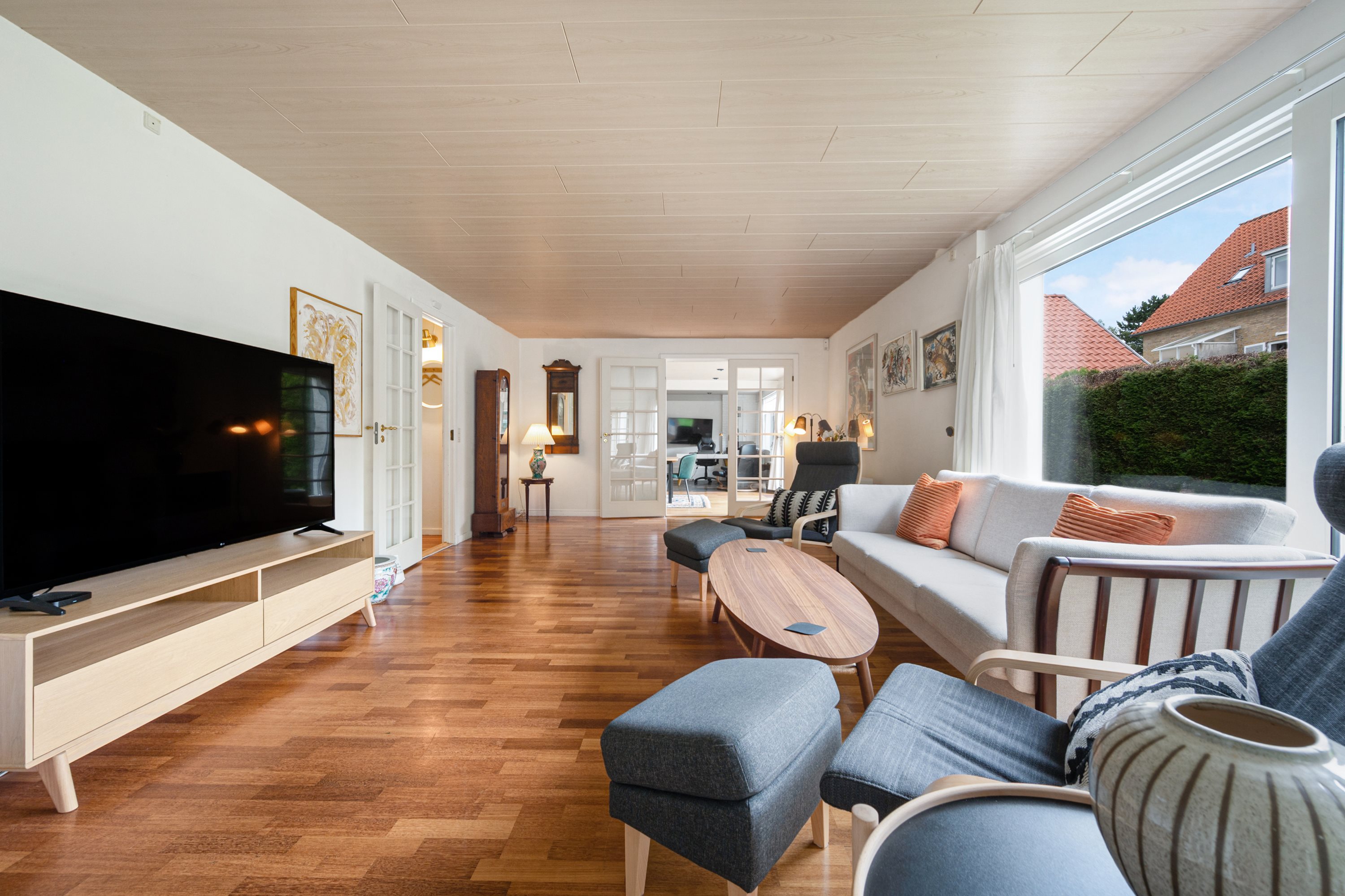 Haven er adskilt af et hegn, således det er muligt at få noget privatliv, selvom jeres kære er på den anden side af hegnet. Ejendommen giver som nævnt mulighed for at bo to generationer på samme matrikel, men under hvert sit tag, eller I kan bo i den ene del og leje den anden del ud.