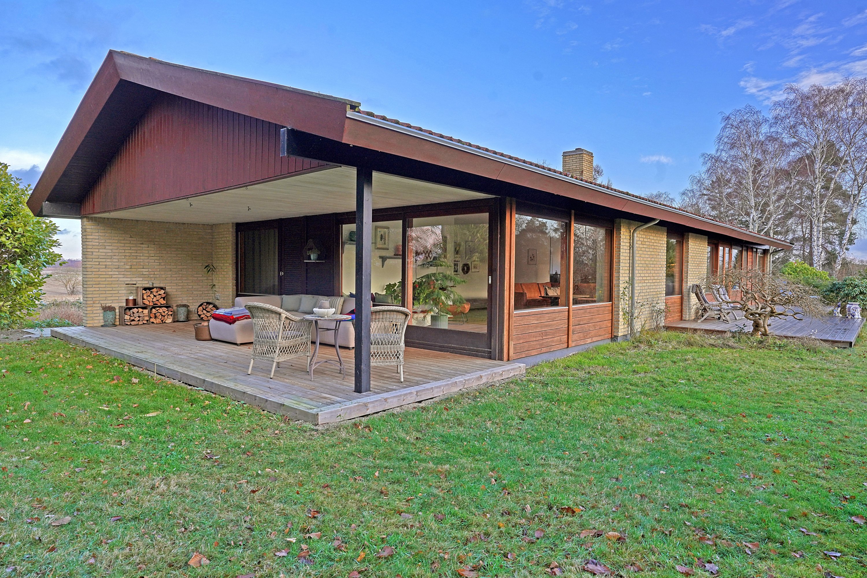 Udelivet er tænkt med i alle detaljer. Fra stuen er der udgang til en stor, overdækket terrasse, der forlænger sæsonen og skaber en lun base fra tidligt forår til langt ind i efteråret. Fra alrummet kan I træde direkte ud på en solrig terrasse med lys det meste af dagen, og på den modsatte side af huset finder I endnu et terrassemiljø, hvor udsigten til den åbne natur er helt betagende – et sted, hvor dagens tempo sænkes helt af sig selv.
