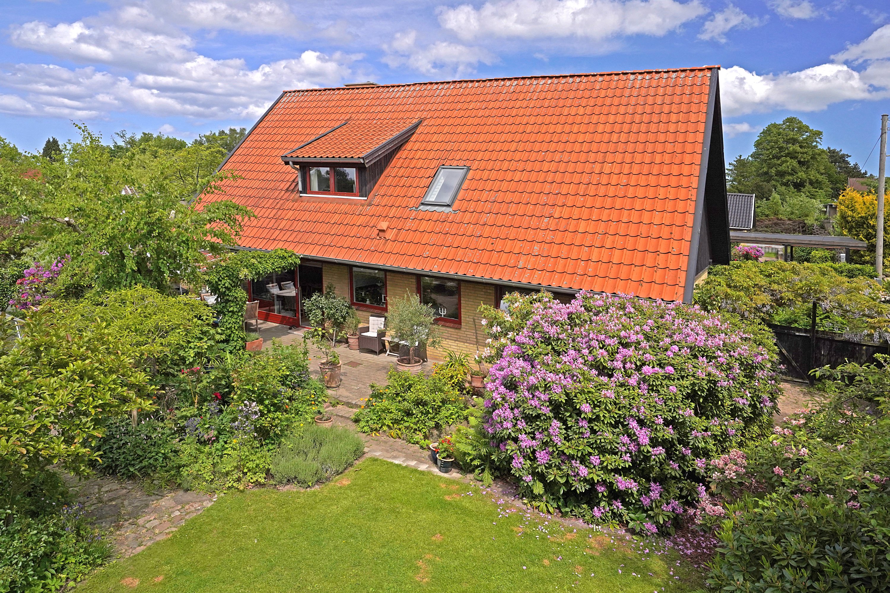 Haven er noget helt særligt. Her er der tænkt på både leg, ro og nærvær – med solrige og skyggefulde kroge, en overdækket terrasse til de lune sommeraftener og masser af plads til udeliv året rundt. En ideel ramme for alt fra børneleg og grillhygge til hverdagskaffe i morgensolen.