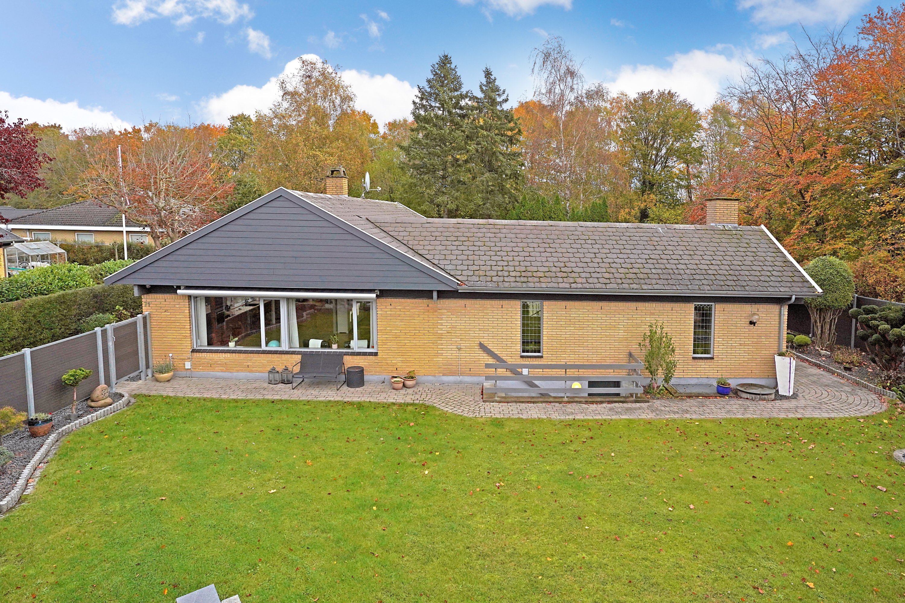 I haven får I fuldkomment privatliv. Her er der virkelig gjort noget ud af æstetikken og beplantet med smukke, velholdte træer og buske i afgrænsede bede. Her er også etableret flere, skønne terrasser, hvor udelivet kan nydes, med fokus på at kunne fange solen fra tidlig morgen og helt til aftenens sidste stråler rammer.