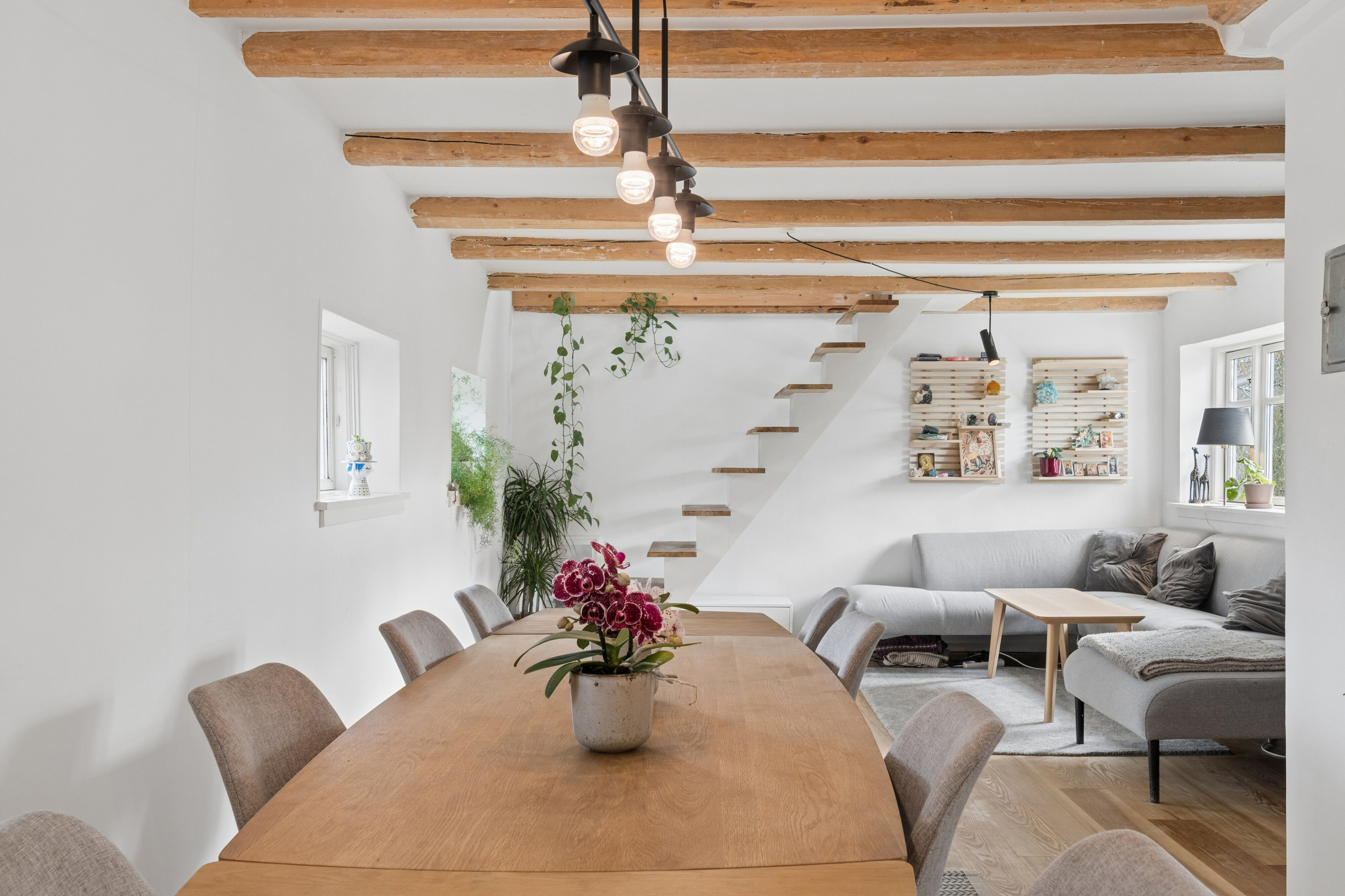Stuen er blandt andet udstyret med gulvvarme og fritlagte bjælker, som tilfører boligen karakter og en særlig atmosfære. I stueplan findes desuden et praktisk gæstetoilet.