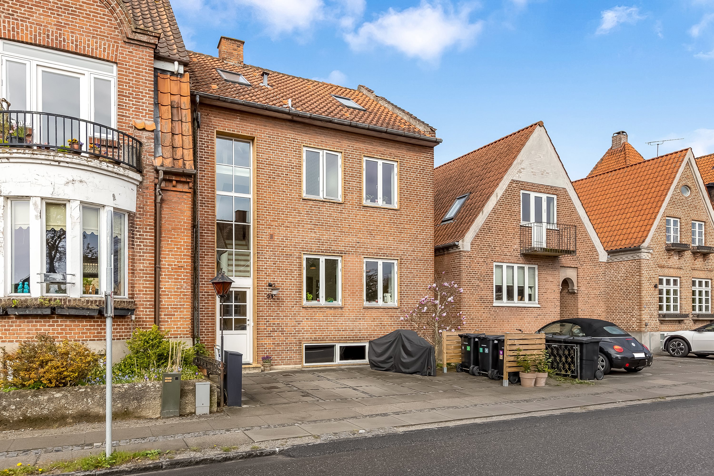 Når du træder ind ad hoveddøren, byder en indbydende entre dig velkommen. Herfra har du direkte adgang til et praktisk garderoberum og en elegant, svungen trappe, der fører til de øvrige niveauer i huset. I hjertet af hjemmet finder du et stort og indbydende spisekøkken, der er holdt i lyse elementer og udstråler varme og funktionalitet. Køkkenet flyder naturligt sammen med en lys og hyggelig stue, der er stor nok til både en sofagruppe og en spiseafdeling. Herfra kan du bevæge dig ud på en skøn terrasse og videre til en lukket, nem gårdhave – det perfekte sted at nyde en stille eftermiddag i solen.