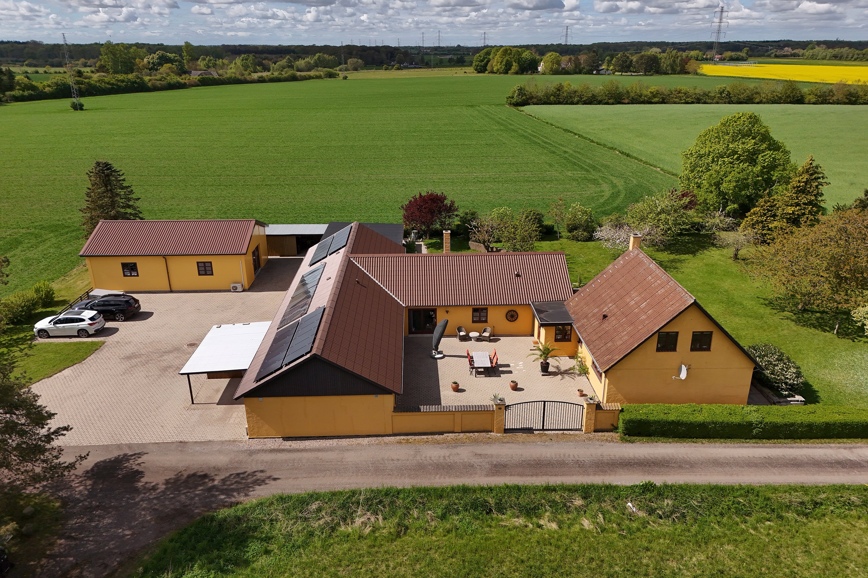 Når du kommer ind på den charmerende gårdsplads, mødes du af en idyllisk atmosfære, hvor de tre længer omfavner et hyggeligt gårdmiljø. Huset er strategisk placeret højt i landskabet og giver en betagende udsigt over åbne marker og skøn natur, hvilket gør det til et sandt fristed for sjælen.