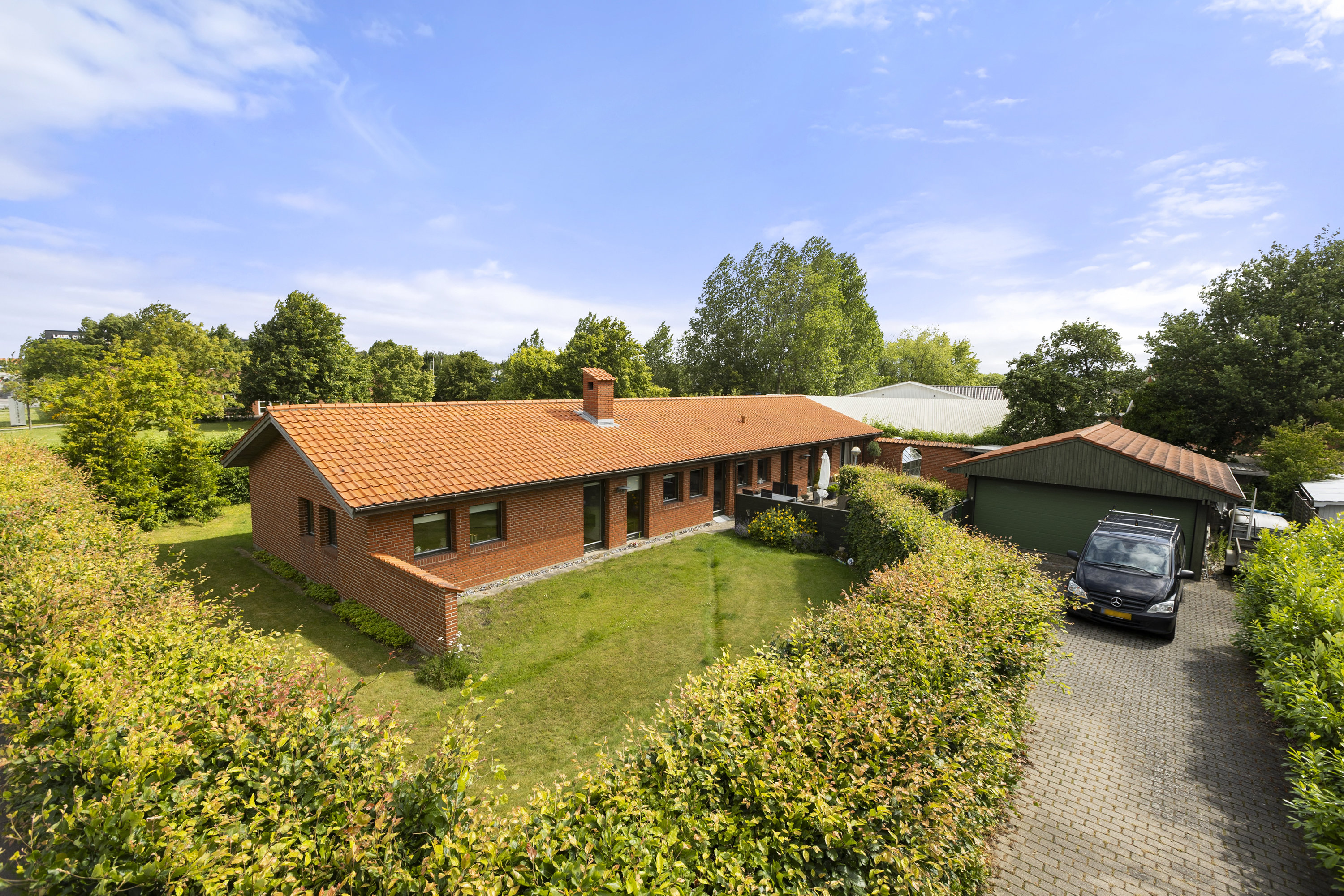 Ude venter en indkørsel til en stor garage med tilhørende to udhuse bagved, hvor man nemt kan opbevare sine haveredskaber, erhvervsdele eller lignende.