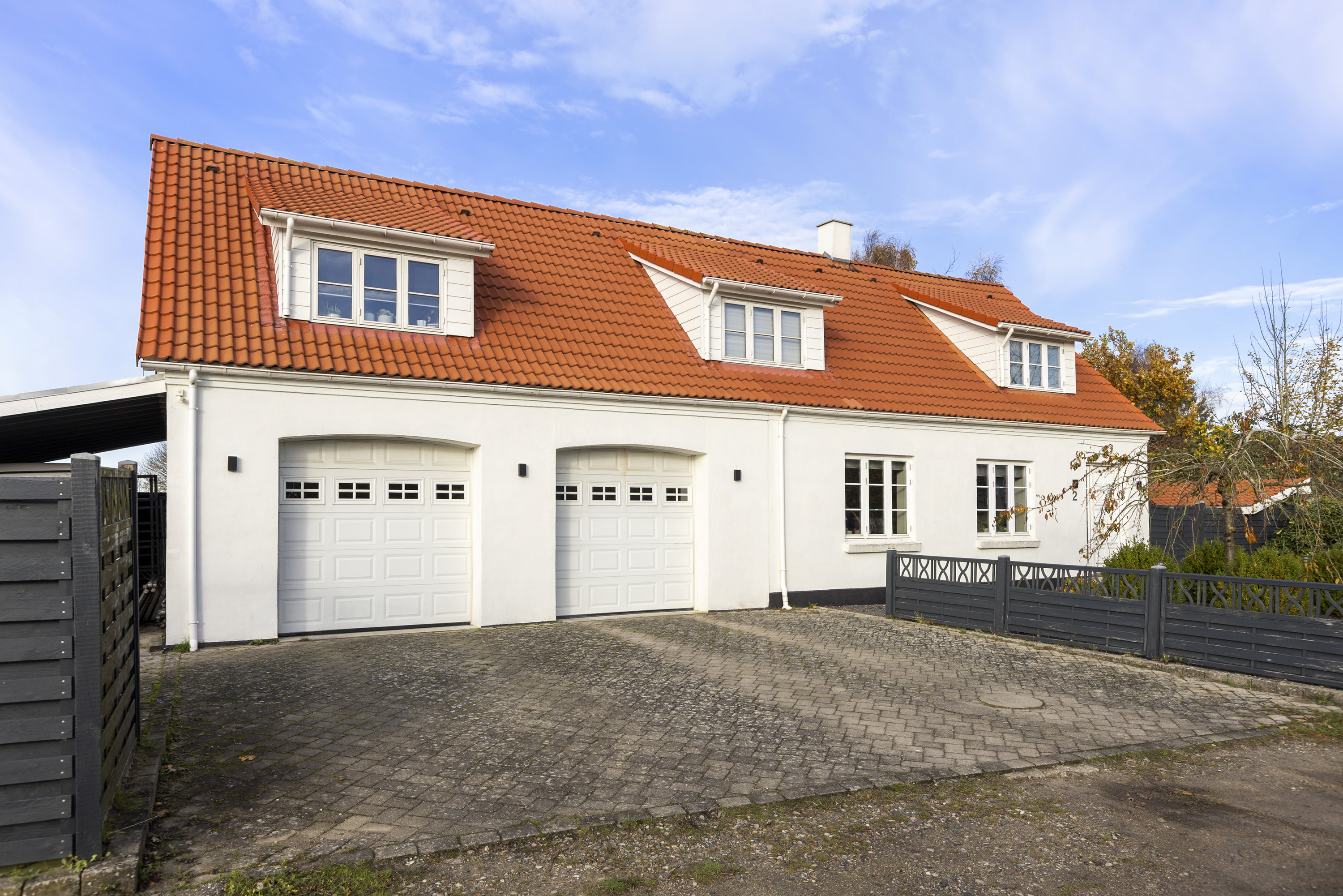 Når I ankommer til ejendommen, vil I bemærke roen sænke sig i den landlige idyl. I kan parkere bilerne tørt i garagen, hvorfra I også kan tilgå hjemmet. Indgangen gennem garagen, vil således blive jeres daglige indgang med indkøbsvarer og hverdags overtøj, mens I kan byde gæster velkommen via hjemmets hyggelige entré. I tilgodeses ligeledes med en helt tredje indgang til hjemmets praktiske bryggers, hvor I får gode betingelser for at samle vaskefaciliteter.