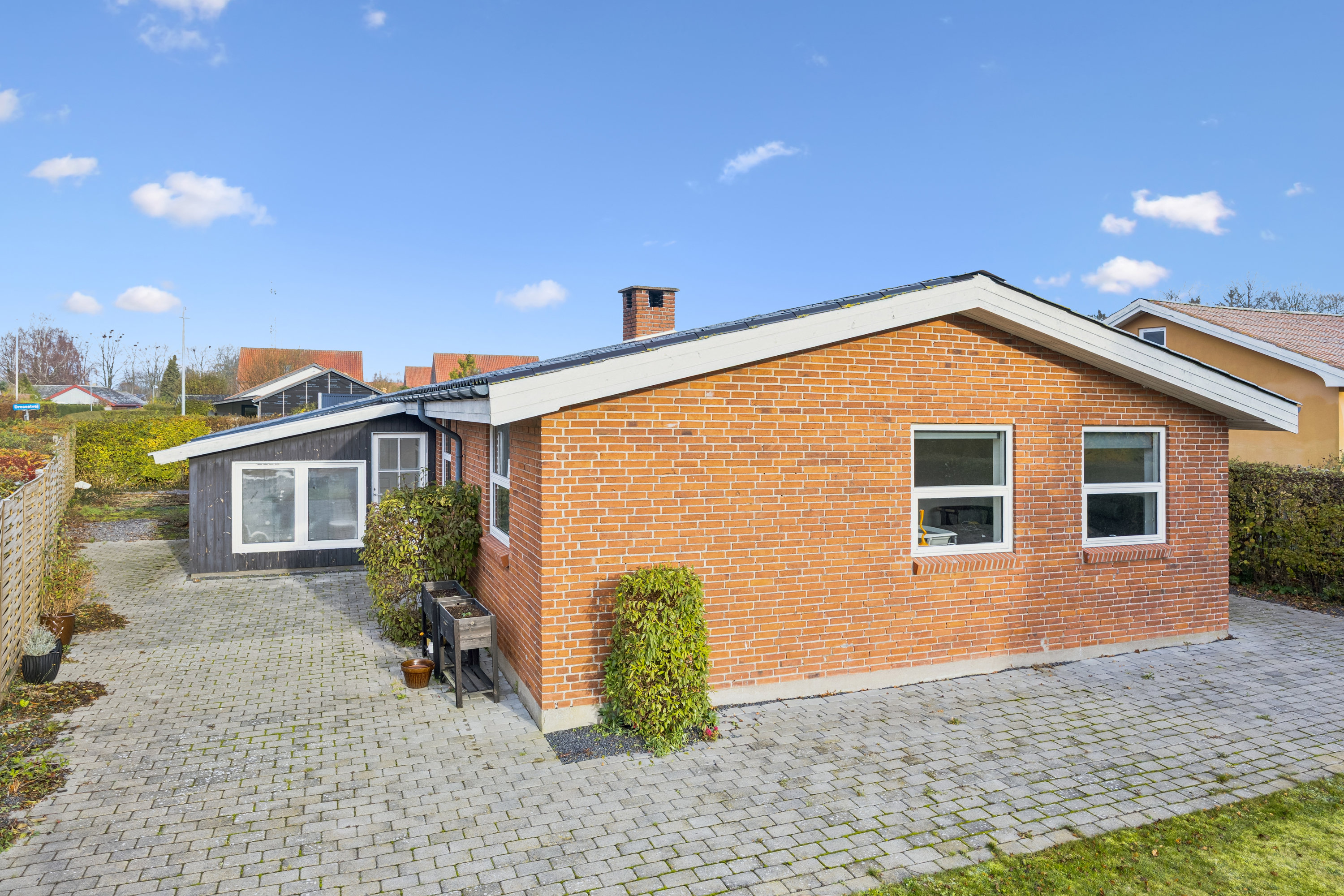 Tilbage på adressen ligger huset på en attraktiv hjørnegrund midt i Høng. Matriklen har en overskuelig størrelse på 650 kvadratmeter, der samtidig giver rige muligheder for udelivet. Fortil er der anlagt en bred indkørsel med både garage og værksted, mens baghaven byder på en nydelig græsplæne. Bagerst i haven er der etableret et hyggeligt, overdækket terrassemiljø i forbindelse med skuret, og derudover bindes hus og græsplæne sammen af en stor fliseterrasse.