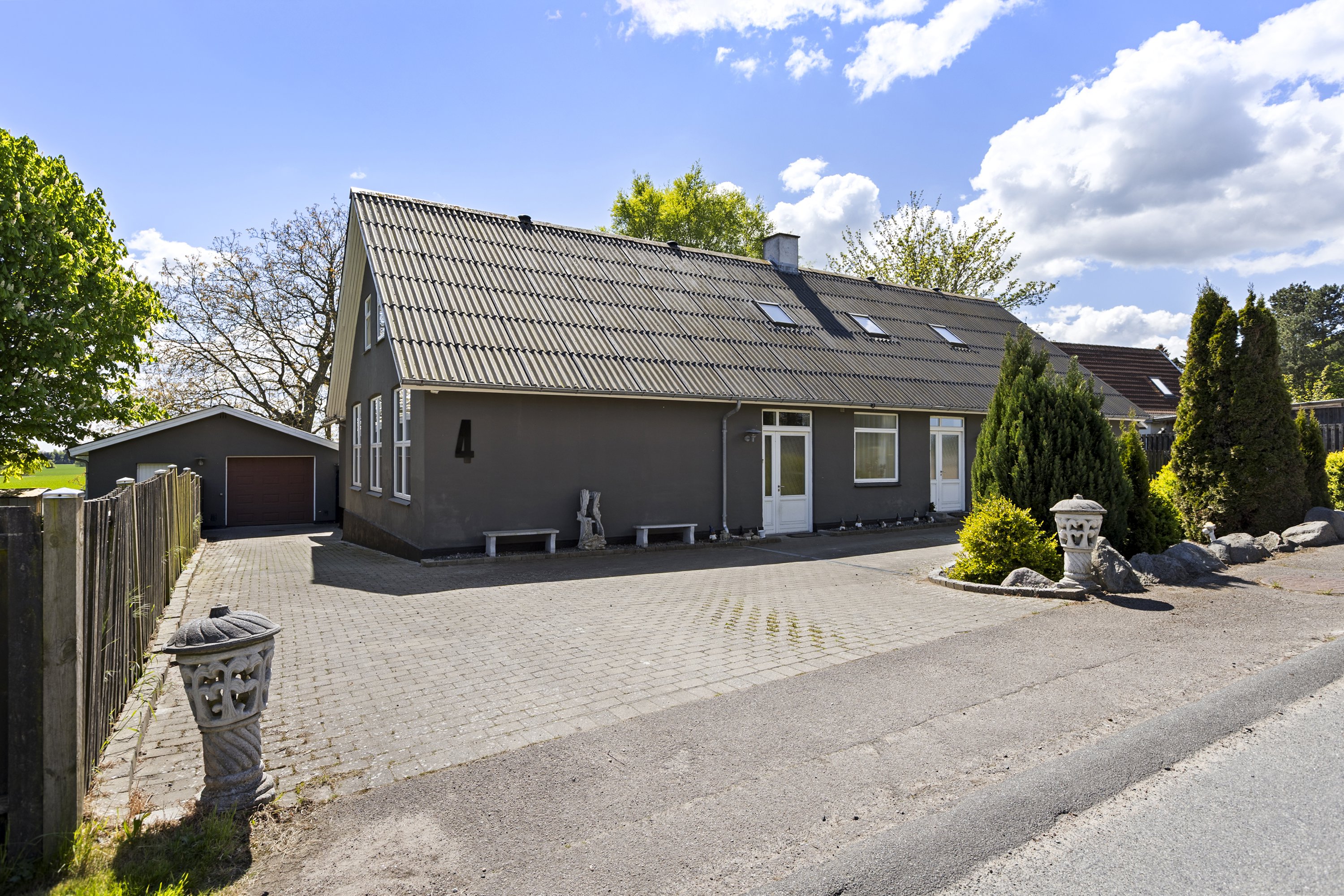 Udenfor strækker ejendommens store grund sig ud og byder på vidtstrakte udsigter over de omkringliggende marker, hvilket sikrer en følelse af fred og ro. Den rummelige garage og den overdækkede terrasse er praktiske tilføjelser, der gør hverdagen lettere og bidrager til livskvaliteten.