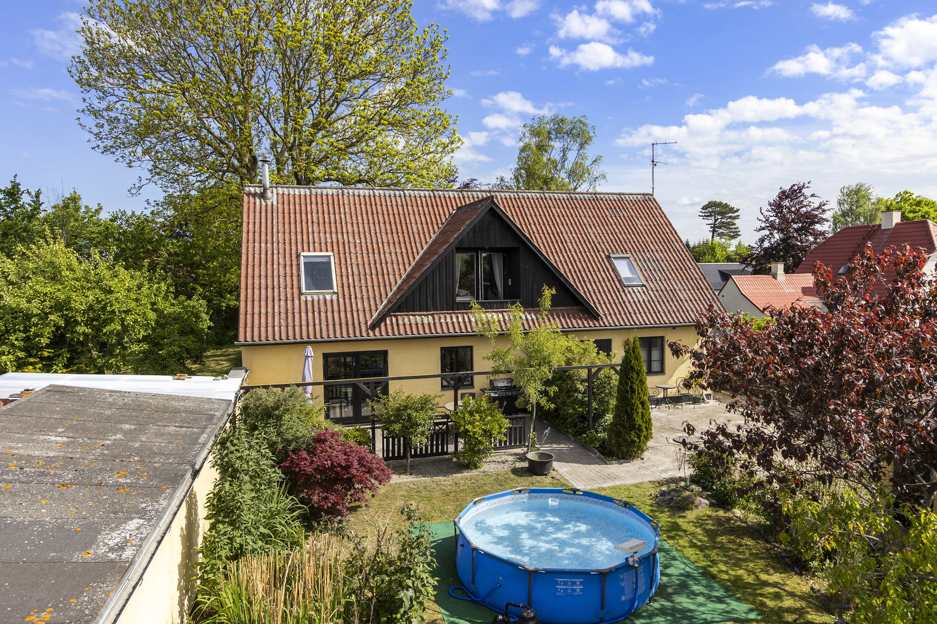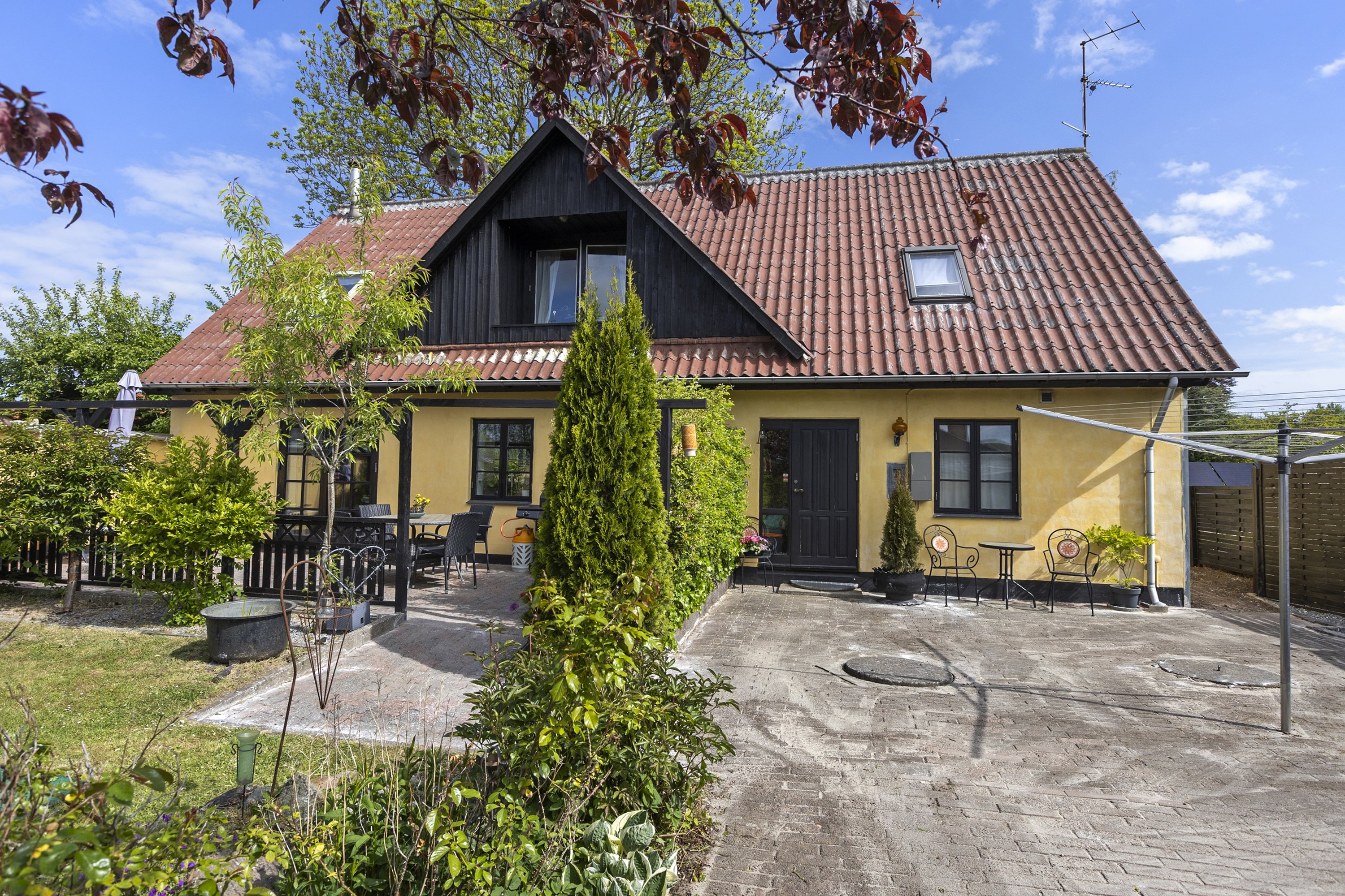 Udendørsområdet er yderst indbydende med en fin have, der inkluderer en hyggelig fliseterrasse mod syd. Her kan du nyde sommerens solrige dage. Der er desuden et ældre, men anvendeligt udhus, der kan bruges til opbevaring eller som værksted. For dem med grønne fingre eller en passion for selvforsyning, ligger bag huset både et drivhus og køkkenhave, som giver masser af plads til kreative udfoldelser i naturen.