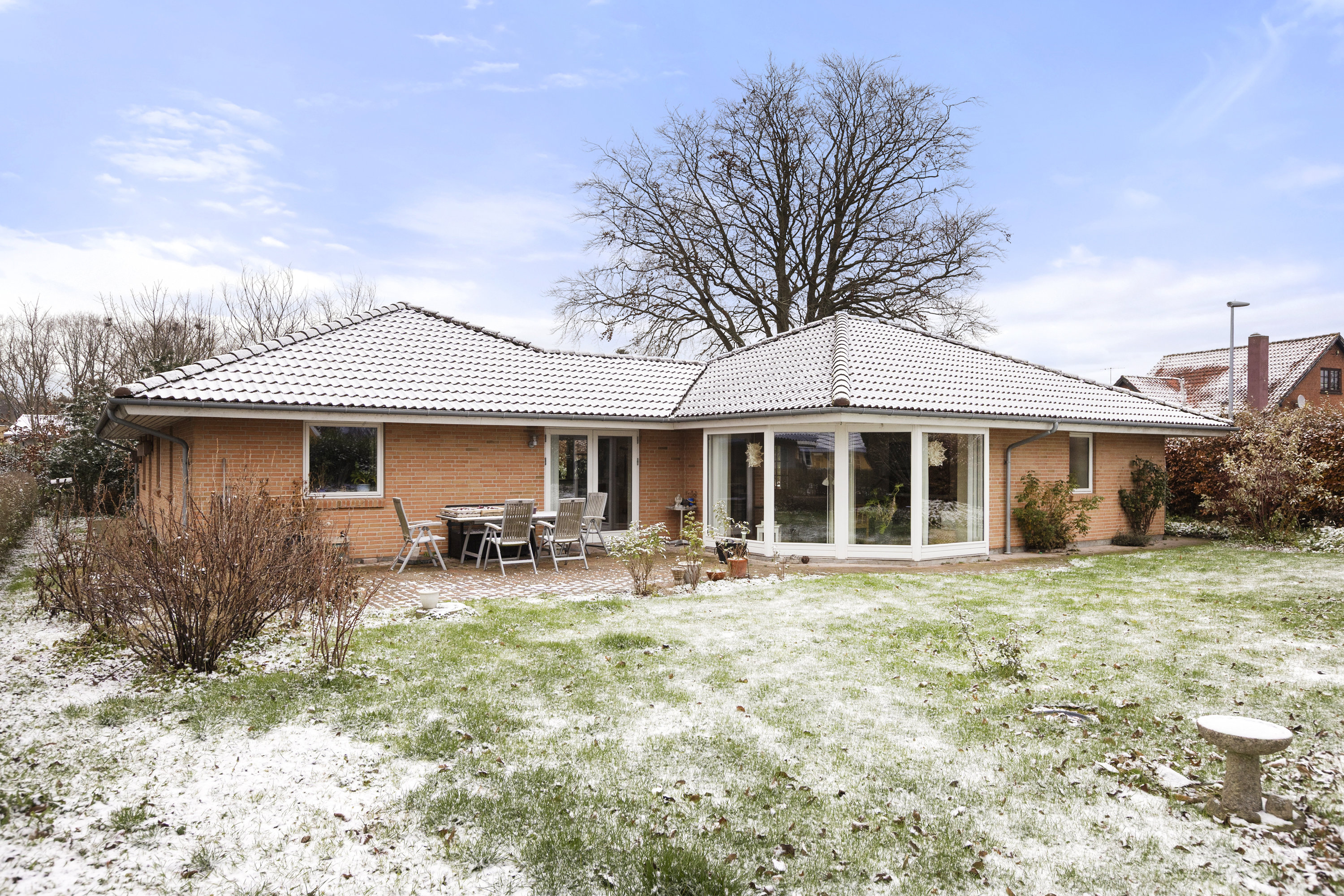 Udendørs venter en smagfuldt anlagt have, komplet med en skøn fliseterrasse – et ideelt sted til sommeraftener og udendørs leg.