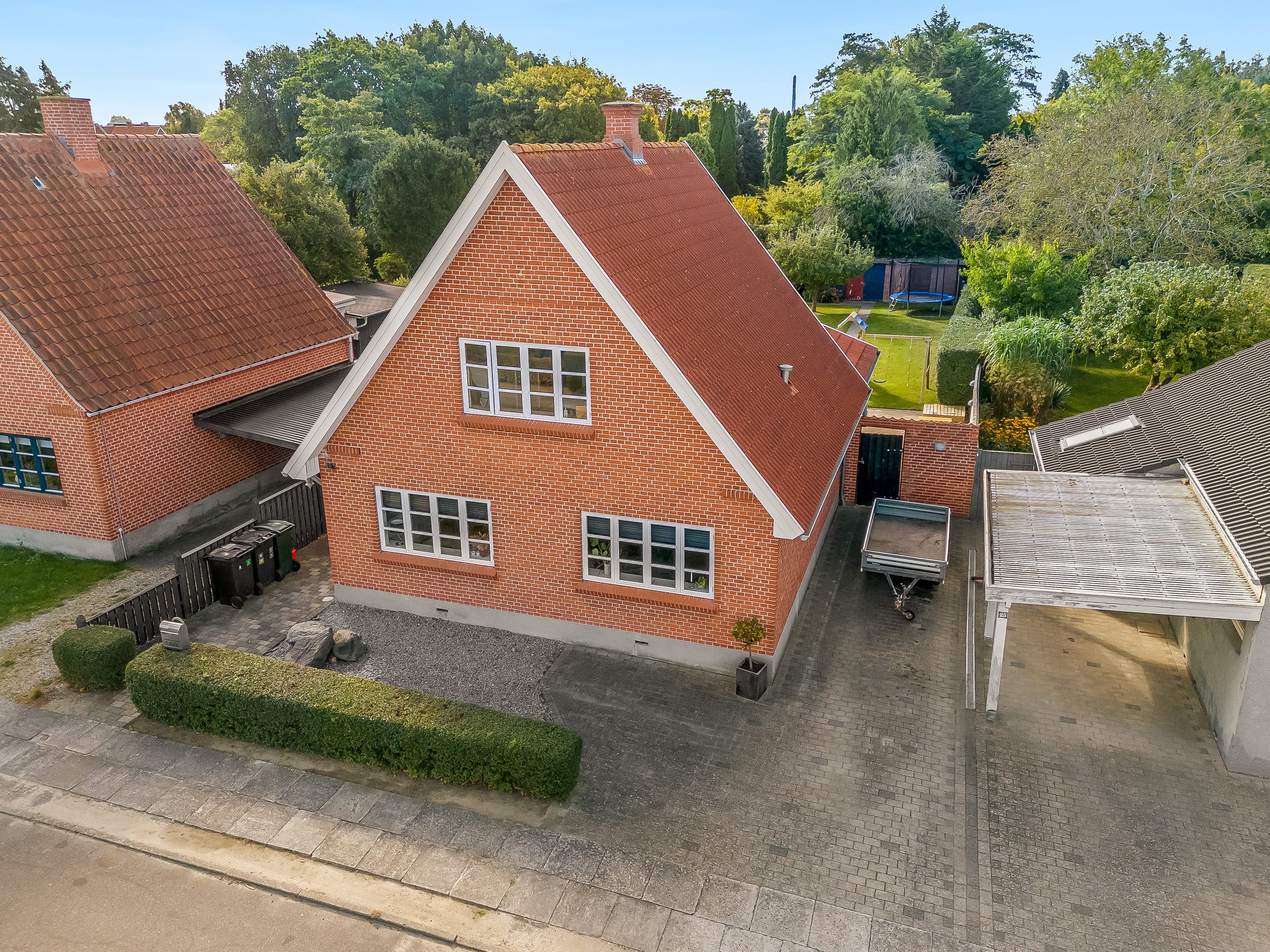 Ejendommen fremstår med et tidstypisk og velholdt udtryk: røde mursten, nyere hvide sprossede vinduer (i hele ejendommen) og høj tagrejsning med skorsten. Forhaven er afgrænset af hæk, og der er indkørsel. Bagtil ligger en privat have med terrasse, plæne til leg og boldspil samt et praktisk skur til opbevaring af redskaber og legetøj mv.