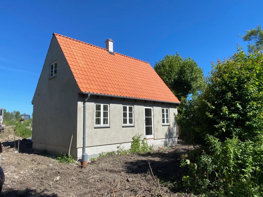 Huset står med pudset facade, rødt tegltag og hvide bondehus vinduer.