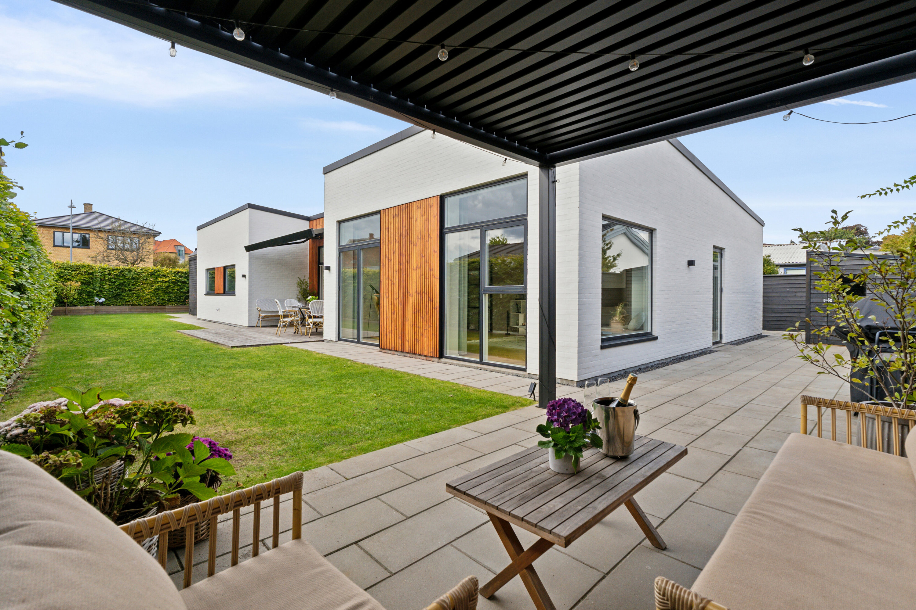 Fra opholdsrummet åbner huset sig mod en solrig sydvendt træterrasse, indrettet til lange sommeraftener med både markise og varmelamper, mens haven er anlagt med øje for nem elegance – smuk, men enkel at passe. Hele huset er udstyret med gulvvarme, som giver en behagelig og ensartet komfort.
