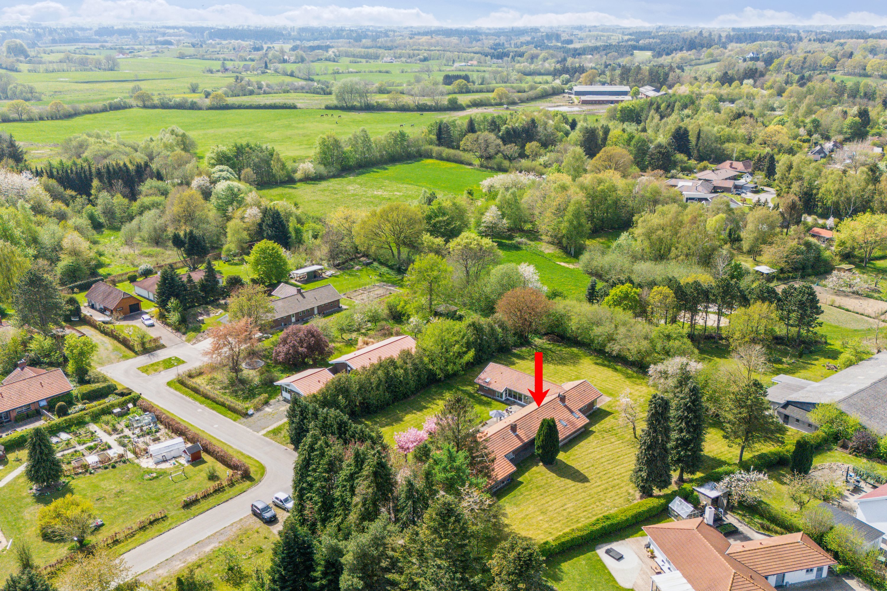 Værelserne kommer i sjældent set gode størrelser, og I forældre kan oplagt have jeres afdeling separat med eget bad. Villaen indrammer en læfuld gårdhave med solvarme fliser langt det meste af dagen, mens der er læ omme på bagsiden ved den integrerede carport. Nogle vil elske synet af de fem ikoniske kirsebærtræer på stribe, og andre vil fornøje sig ved at kunne smutte direkte over på den fælles legeplads, som bliver jeres nabo fra den lille, lukkede villavej.