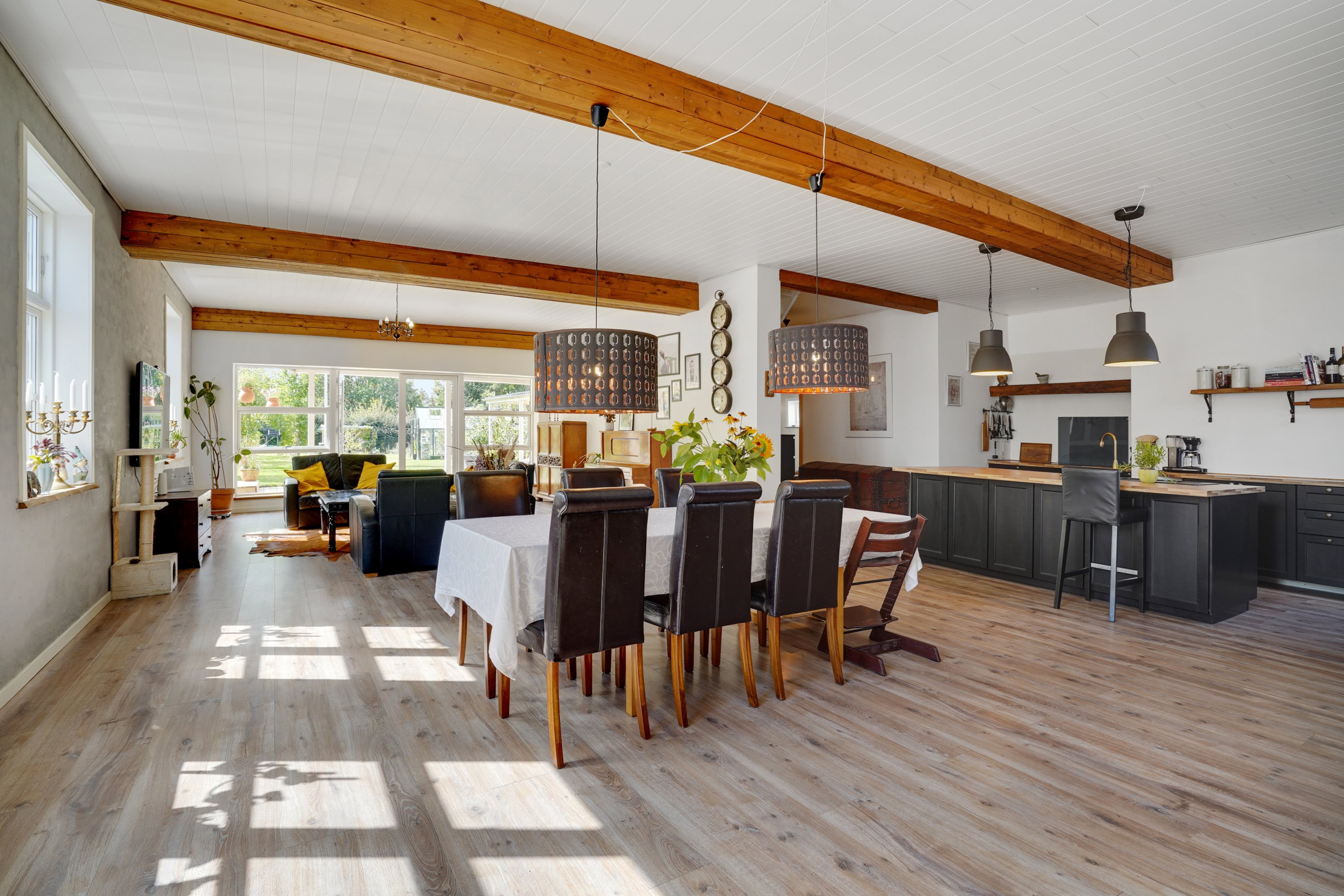 Den store bolig på 280 m² indeholder entré, stort køkkenalrum i åben forbindelse med opholdsstuen, hvor der er højt til loftet og synlige bjælker. Fra dette skønne rum er der udgang til den sydvendte terrasse. I stueplan er der et dejligt stort badeværelse med nedsænket spabad og bruseniche, på denne etage er der også et ekstra toilet.