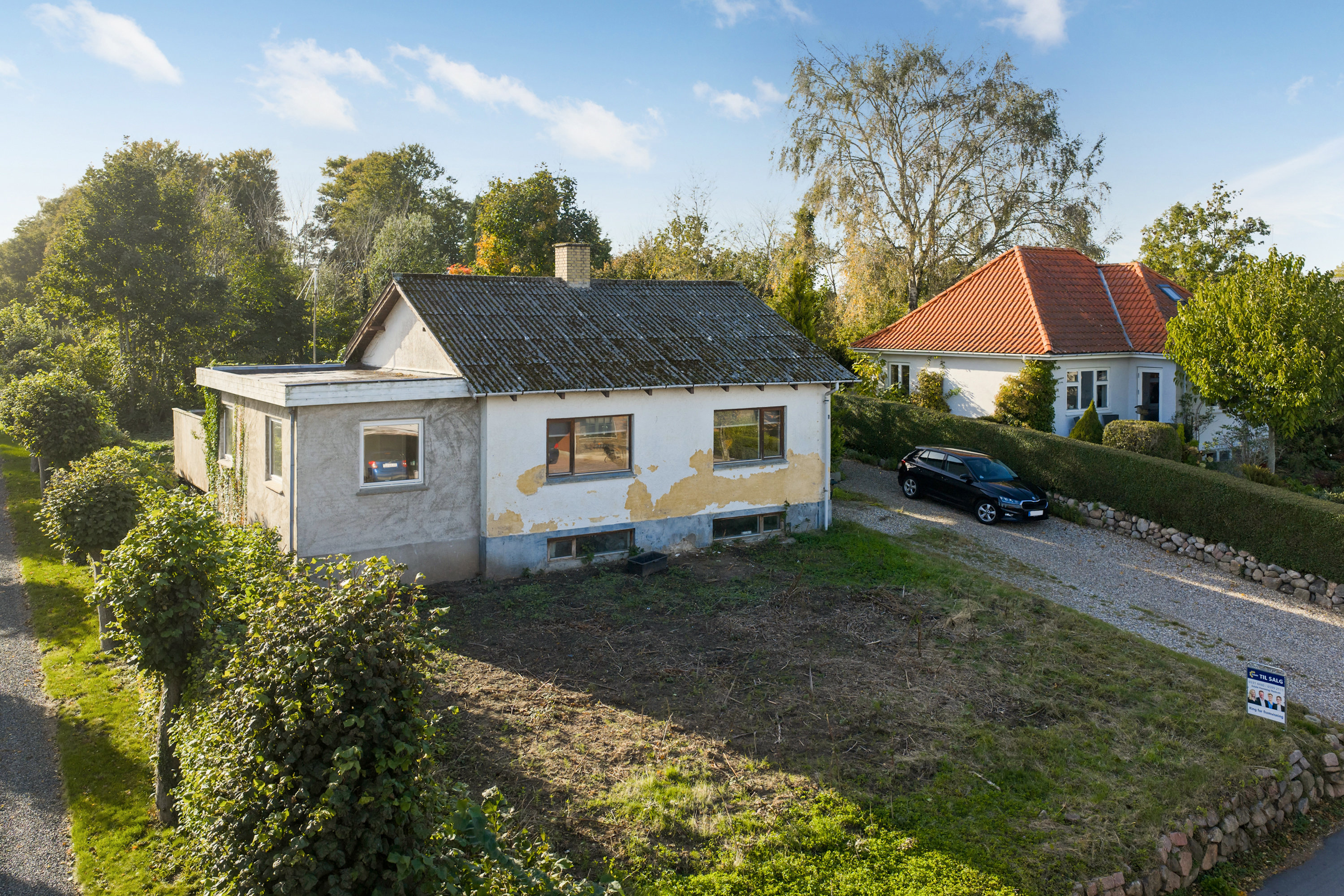 Når du ankommer til huset, er det vigtigt at tage ja-hatten på og se mulighederne! Foran huset er der god plads til parkering – måske endda mulighed for at opføre en carport? Den store forhave er i øjeblikket tilgroet, men med lidt arbejde kan den forvandles til et grønt åndehul. Her kan du anlægge blomsterbede, en græsplæne eller måske en nedgravet trampolin til børnene. En østvendt terrasse i forhaven ville også være oplagt – perfekt til at nyde morgenkaffen, mens solen står op.