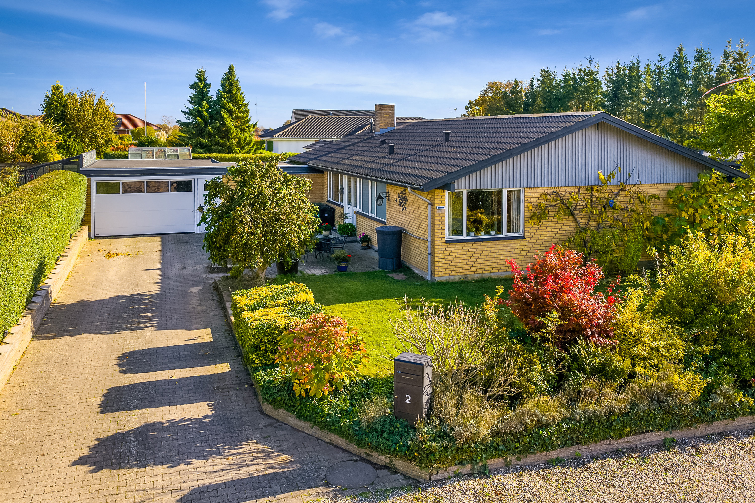 Fra stuen er der udgang til den delvist overdækkede sydterrasse med sol fra morgen til aften - perfekt til grill og afslapning. Haven byder på plæne, nyttehave og drivhus, mens et separat værksted ved garagen giver god opbevaring og arbejdsplads.