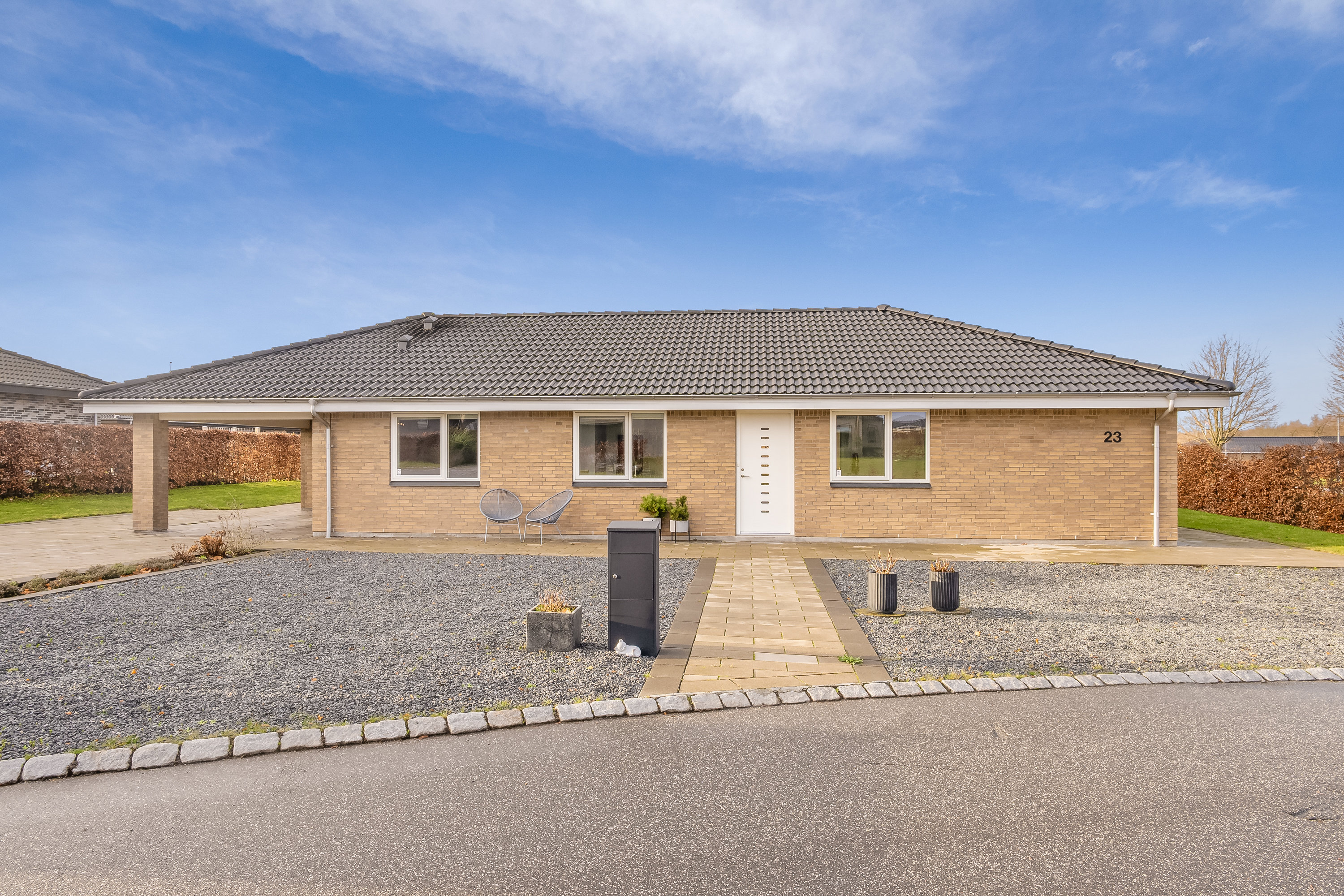 Huset fremstår knivskarpt med alle de kvaliteter, man forventer af et moderne byggeri: gulvvarme i hele huset, spots i loftet og mulighed for en lader til elbil i carporten.