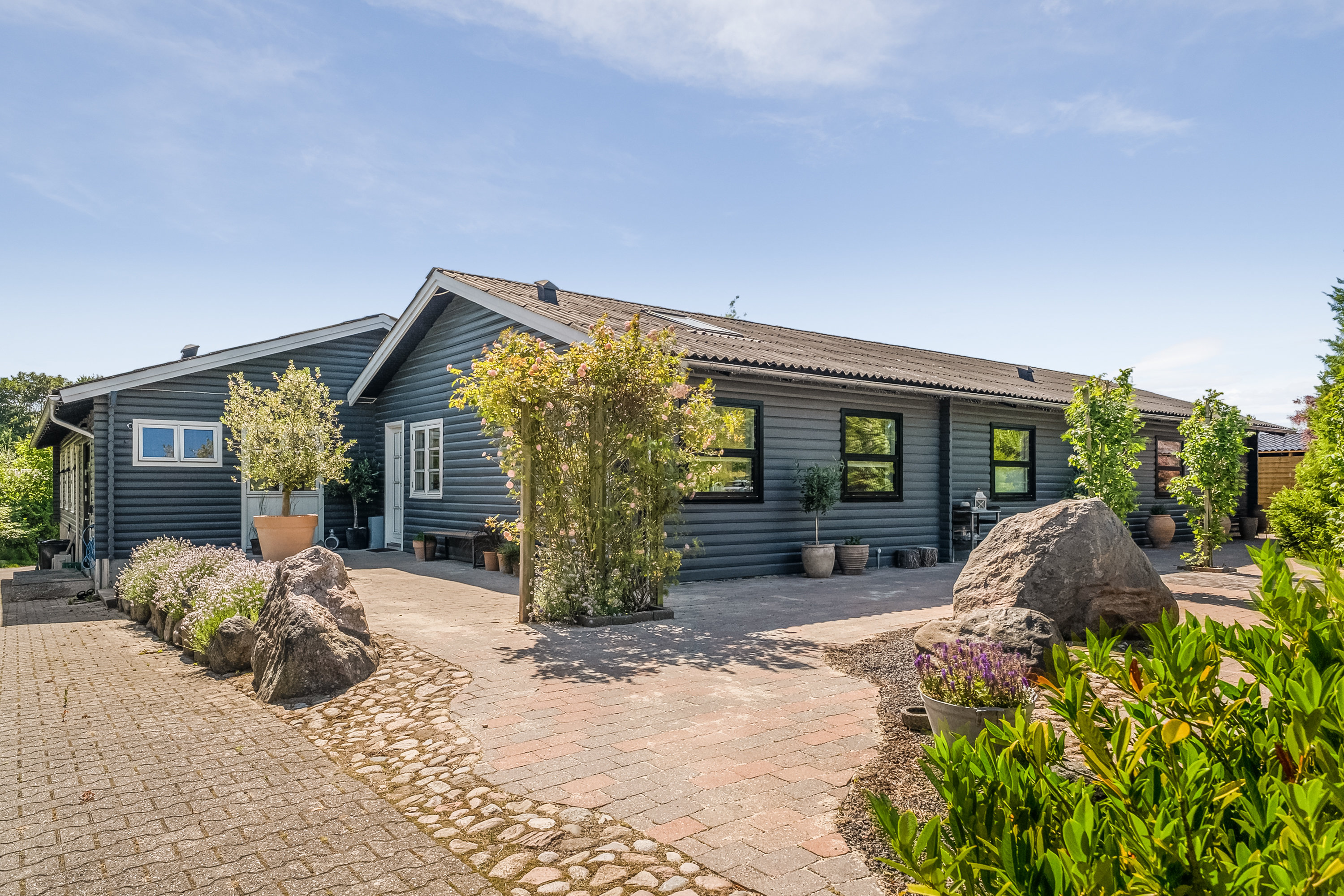 Udenfor venter den skønne træterrasse med en vinplante, der slynger sig op under taget og skaber en skøn stemning. Ved siden af ligger en stor, flisebelagt gårdhave. Her er buske, lavendler, små træer og et drivhus. En lille trappe fører dig videre ned i den grønne haveoase med nedgravet trampolin og masser af plads til liv, leg og ro.